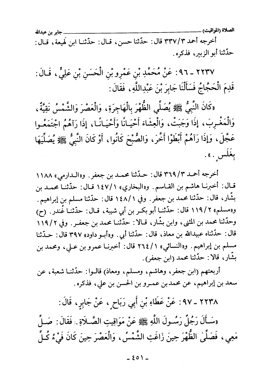 ٢٢٣٧ - عَنْ مُحَمَّدِ بْنِ عَمْرِو بْنِ الْحَسَنِ بْنِ عَلِيٍّ، قَالَ: قَدِمَ الْحَجَّاجُ الْمَدِينَةَ، فَسَأَلْنَا جَابِرَ بْنَ عَبْدِ اللهِ، فَقَالَ: