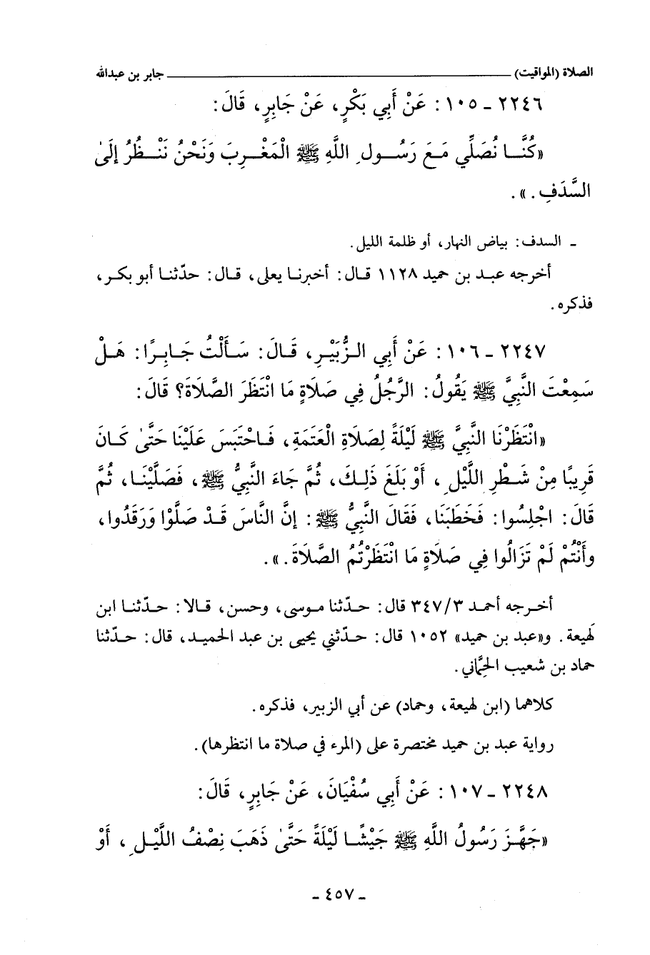 ٢٢٤٧ - عَنْ أَبِي الزُّبَيْرِ، قَالَ: سَأَلْتُ جَابِرًا: هَلْ سَمِعْتَ النَّبِيَّ صلى الله عليه وسلم يَقُولُ: الرَّجُلُ فِي صَلَاةٍ مَا انْتَظَرَ الصَّلَاةَ؟ قَالَ: