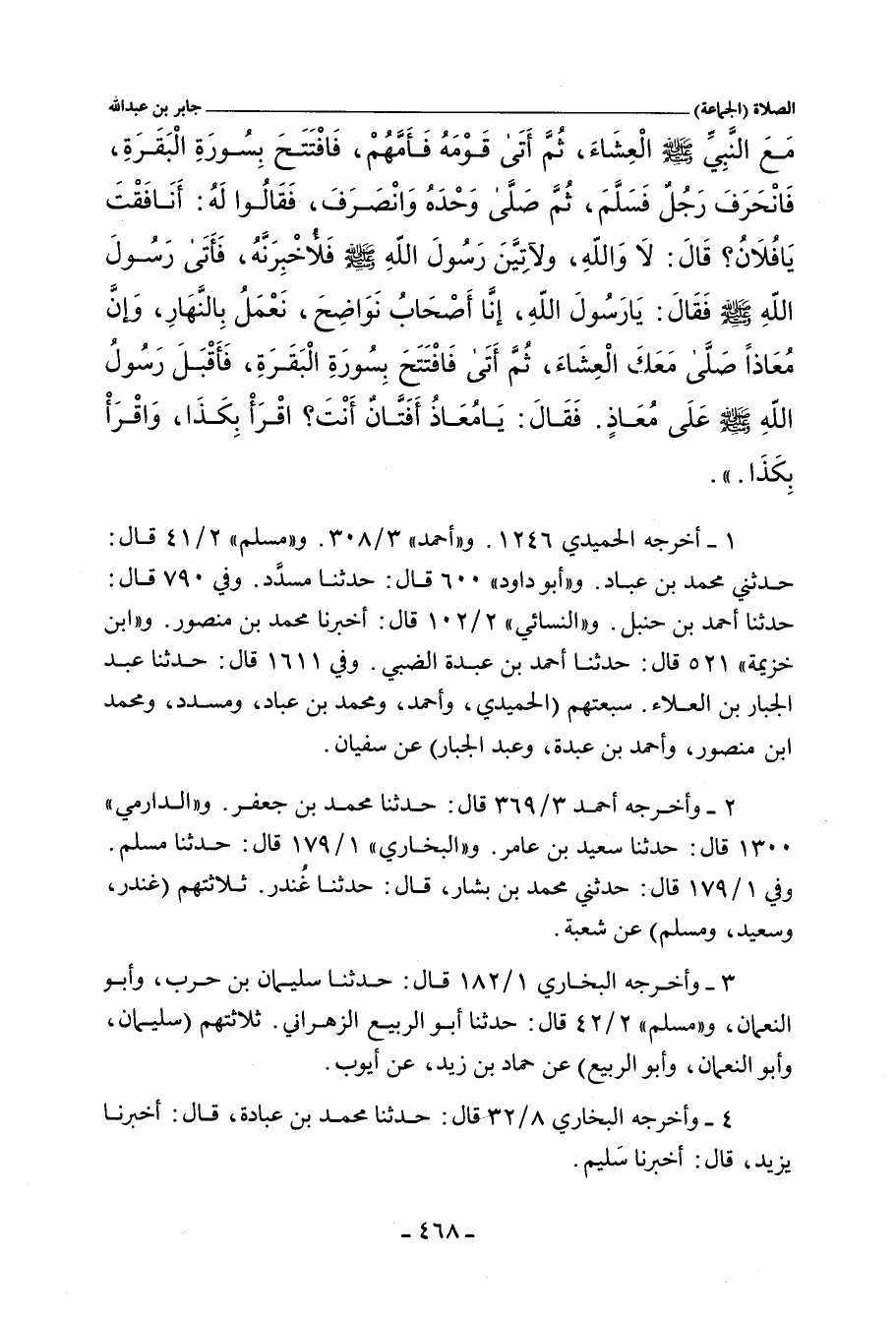 مَعَ النَّبِيِّ صلى الله عليه وسلم الْعِشَاءَ، ثُمَّ أَتَى قَوْمَهُ فَأَمَّهُمْ، فَافْتَتَحَ بِسُورَةِ الْبَقَرَةِ، فَانْحَرَفَ رَجُلٌ فَسَلَّمَ، ثُمَّ صَلَّى وَحْدَهُ وَانْصَرَفَ، فَقَالُوا لَهُ: أَنَافَقْتَ يَا فُلَانُ؟ قَالَ: لَا وَاللهِ، وَلآتِيَنَّ رَسُولَ اللهِ صلى الله عليه وسلم فَلأُخْبِرَنَّهُ، فَأَتَى رَسُولَ اللهِ صلى الله عليه وسلم، فَقَالَ: يَا رَسُولَ اللهِ، إِنَّا أَصْحَابُ نَوَاضِحَ، نَعْمَلُ بِالنَّهَارِ، وَإِنَّ مُعَاذًا صَلَّى مَعَكَ الْعِشَاءَ، ثُمَّ أَتَى فَافْتَتَحَ بِسُورَةِ الْبَقَرَةِ، فَأَقْبَلَ رَسُولُ اللهِ صلى الله عليه وسلم عَلَى مُعَاذٍ، فَقَالَ: يَا مُعَاذُ، أَفَتَّانٌ أَنْتَ؟ اقْرَأْ بِكَذَا، وَاقْرَأْ بِكَذَا.