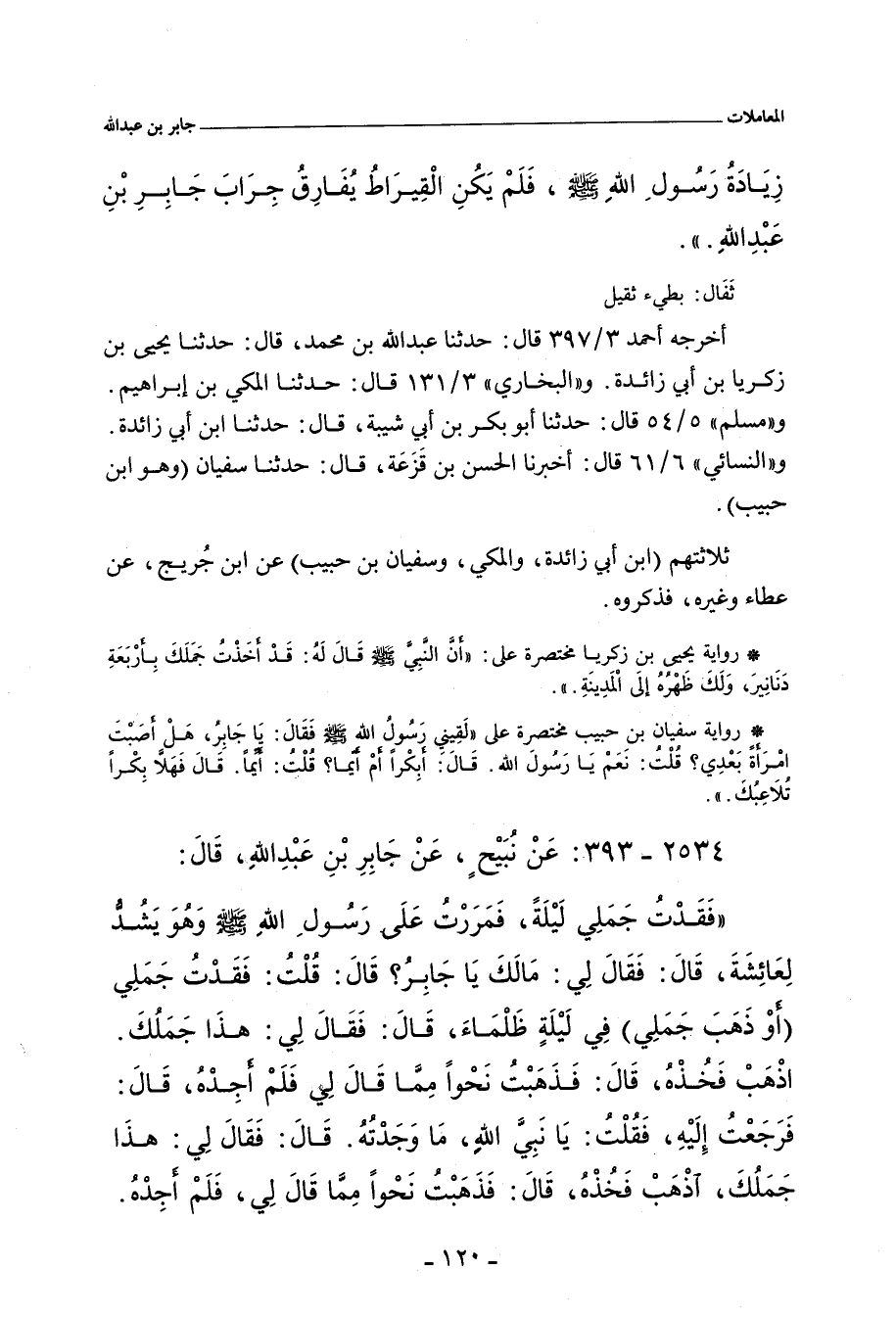 كلاهما (أحمد , ومُسْلم) عن عَبْد اللهِ بن مُحَمد، أَبي بَكْر بن أَبي شَيْبَة، حدَّثنا يَحيى بن زكريا بن أَبي زائدة، عن ابن جُرَيْج، عَنْ عَطَاءٍ، عَنْ جَابِرٍ، أَنَّ النَّبِيَّ صلى الله عليه وسلم قَالَ لَهُ: