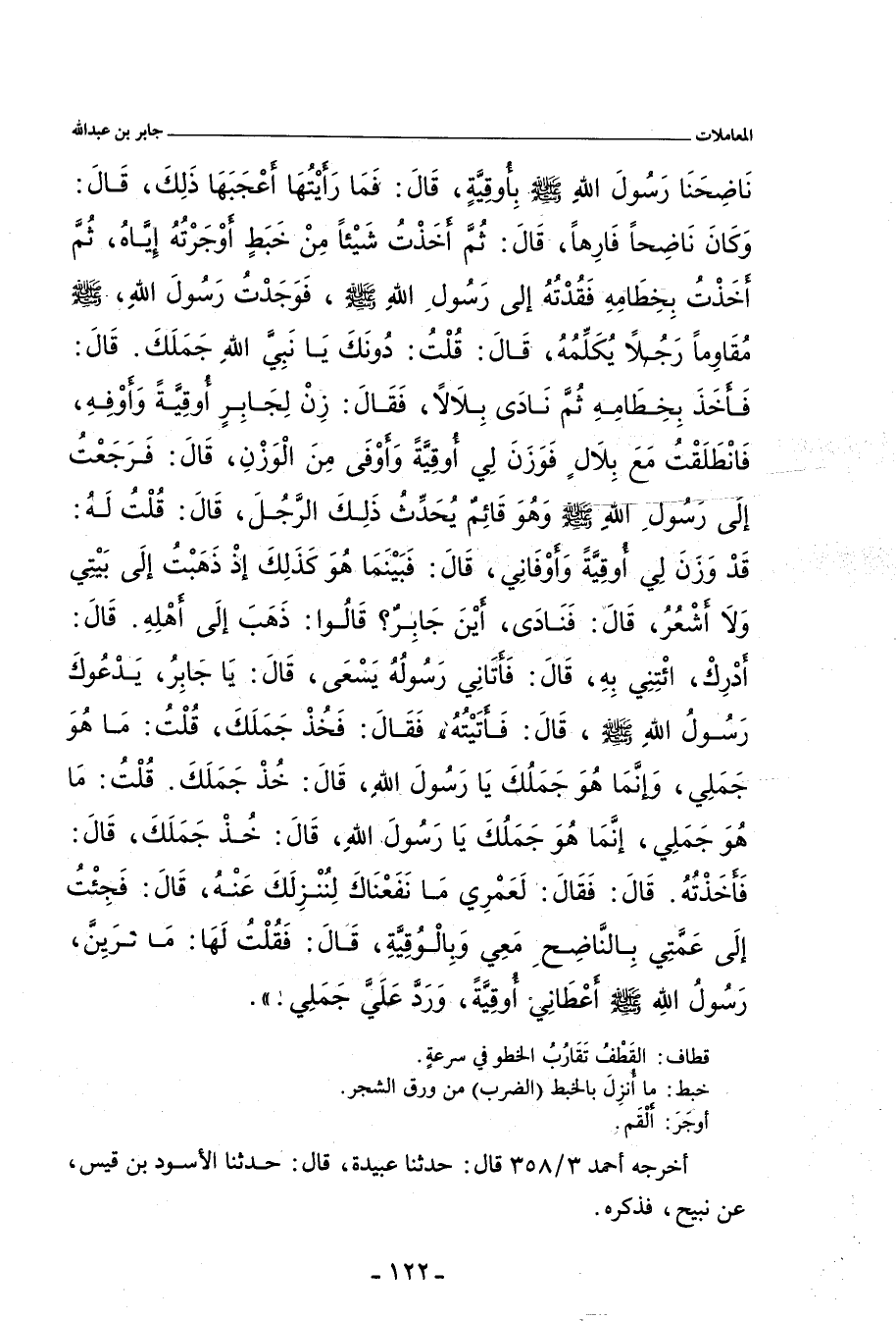 نَاضِحَنَا رَسُولَ اللهِ صلى الله عليه وسلم بِأُوقِيَّةٍ، قَالَ: فَمَا رَأَيْتُهَا أَعْجَبَهَا ذَلِكَ، قَالَ: وَكَانَ نَاضِحًا فَارِهًا، قَالَ: ثُمَّ أَخَذْتُ شَيْئًا مِنْ خَبَطٍ أَوْجَرْتُهُ إِيَّاهُ، ثُمَّ أَخَذْتُ بِخِطَامِهِ، فَقُدْتُهُ إِلَى رَسُولِ اللهِ صلى الله عليه وسلم، فَوَجَدْتُ رَسُولَ اللهِ صلى الله عليه وسلم مُقَاوِمًا رَجُلاً يُكَلِّمُهُ، قَالَ: قُلْتُ: دُونَكَ يَا نَبِيَّ اللهِ جَمَلَكَ، قَالَ: فَأَخَذَ بِخِطَامِهِ، ثُمَّ نَادَى بِلَالاً، فَقَالَ: زِنْ لِجَابِرٍ أُوقِيَّةً وَأَوْفِهِ، فَانْطَلَقْتُ مَعَ بِلَالٍ، فَوَزَنَ لِي أُوقِيَّةً وَأَوْفَانِي الْوَزْنَ، قَالَ: فَرَجَعْتُ إِلَى رَسُولِ اللهِ صلى الله عليه وسلم، وَهُوَ