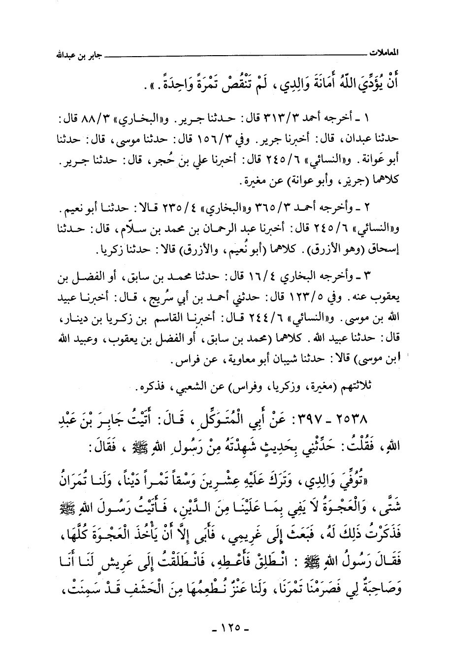 - وفي رواية: أُصِيبَ عَبْدُ اللهِ، وَتَرَكَ عِيَالَا وَدَيْنًا، فَطَلَبْتُ إِلَى أَصْحَابِ الدَّيْنِ أَنْ يَضَعُوا بَعْضًا مِنْ دَيْنِهِ، فَأَبَوْا، فَأَتَيْتُ النَّبِيَّ صلى الله عليه وسلم فَاسْتَشْفَعْتُ بِهِ عَلَيْهِمْ، فَأَبَوْا، فَقَالَ: صَنِّفْ تَمْرَكَ كُلَّ شَيْءٍ مِنْهُ عَلَى حِدَتِهِ، عِذْقَ ابْنِ زَيْدٍ عَلَى حِدَةٍ، وَاللِّينَ عَلَى حِدَةٍ، وَالْعَجْوَةَ عَلَى حِدَةٍ، ثُمَّ أَحْضِرْهُمْ حَتَّى آتِيَكَ، فَفَعَلْتُ، ثُمَّ جَاءَ صلى الله عليه وسلم فَقَعَدَ عَلَيْهِ، وَكَالَ لِكُلِّ رَجُلٍ حَتَّى اسْتَوْفَى، وَبَقِيَ التَّمْرُ كَمَا هُوَ كَأَنَّهُ لَمْ يُمَسَّ.