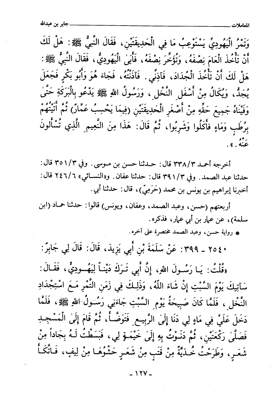 وَلِيَهُودِيٍّ عَلَيْهِ تَمْرٌ، وَتَمْرُ الْيَهُودِيِّ يَسْتَوْعِبُ مَا فِي الْحَدِيقَتَيْنِ، فَقَالَ لَهُ رَسُولُ اللهِ صلى الله عليه وسلم: هَلْ لَكَ أَنْ تَأْخُذَ الْعَامَ بَعْضًا، وَتُؤَخِّرَ بَعْضًا إِلَى قَابِلٍ؟ فَأَبَى، فَقَالَ رَسُولُ اللهِ صلى الله عليه وسلم: إِذَا حَضَرَ الْجِدَادُ فَآذِنِّي، قَالَ: فَآذَنْتُهُ، فَجَاءَ النَّبِيُّ صلى الله عليه وسلم، وَأَبُو بَكْرٍ، وَعُمَرُ، فَجَعَلْنَا نَجِدُّ، وَيُكَالُ لَهُ مِنْ أَسْفَلِ النَّخْلِ، وَرَسُولُ اللهِ صلى الله عليه وسلم يَدْعُو بِالْبَرَكَةِ، حَتَّى أَوْفَيْنَاهُ جَمِيعَ حَقِّهِ مِنْ أَصْغَرِ الْحَدِيقَتَيْنِ (فِيمَا يَحْسِبُ عَمَّارٌ) ثُمَّ أَتَيْنَاهُمْ بِرُطَبٍ وَمَاءٍ، فَأَكَلُوا وَشَرِبُوا، ثُمَّ قَالَ: هَذَا مِنْ النَّعِيمِ الَّذِي تُسْأَلُونَ عَنْهُ.