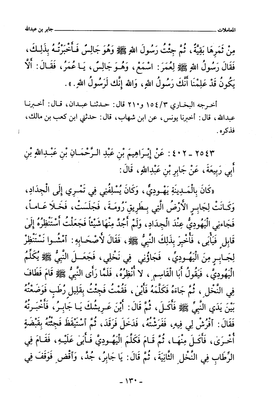 كَانَ بِالْمَدِينَةِ يَهُودِيٌّ، وَكَانَ يُسْلِفُنِي فِي تَمْرِي إِلَى الْجِدَادِ، وَكَانَتْ لِجَابِرٍ الأَرْضُ الَّتِي بِطَرِيقِ رُومَةَ، فَجَلَسَتْ، فَخَلَا عَامًا، فَجَاءَنِي الْيَهُودِيُّ عِنْدَ الْجِدَادِ، وَلَمْ أَجُدَّ مِنْهَا شَيْئًا، فَجَعَلْتُ أَسْتَنْظِرُهُ إِلَى قَابِلٍ، فَيَأْبَى، فَأُخْبِرَ بِذَلِكَ النَّبِيُّ صلى الله عليه وسلم، فَقَالَ لأَصْحَابِهِ: امْشُوا نَسْتَنْظِرْ لِجَابِرٍ مِنَ الْيَهُودِيِّ، فَجَاؤُونِي فِي نَخْلِي، فَجَعَلَ النَّبِيُّ صلى الله عليه وسلم يُكَلِّمُ الْيَهُودِيَّ، فَيَقُولُ: أَبَا الْقَاسِمِ، لَا أُنْظِرُهُ، فَلَمَّا رَأَى النَّبِيُّ صلى الله عليه وسلم قَامَ فَطَافَ فِي النَّخْلِ، ثُمَّ جَاءَهُ فَكَلَّمَهُ، فَأَبَى، فَقُمْتُ فَجِئْتُ بِقَلِيلِ رُطَبٍ، فَوَضَعْتُهُ بَيْنَ يَدَيِ النَّبِيِّ صلى الله عليه وسلم، فَأَكَلَ، ثُمَّ قَالَ: أَيْنَ عَرِيشُكَ يَا جَابِرُ؟ فَأَخْبَرْتُهُ، فَقَالَ: افْرُشْ لِي فِيهِ، فَفَرَشْتُهُ، فَدَخَلَ فَرَقَدَ، ثُمَّ اسْتَيْقَظَ، فَجِئْتُهُ بِقَبْضَةٍ أُخْرَى، فَأَكَلَ مِنْهَا، ثُمَّ قَامَ فَكَلَّمَ الْيَهُودِيَّ، فَأَبَى عَلَيْهِ، فَقَامَ فِي الرِّطَابِ فِي النَّخْلِ الثَّانِيَةَ، ثُمَّ قَالَ: يَا جَابِرُ، جُدَّ وَاقْضِ، فَوَقَفَ فِي