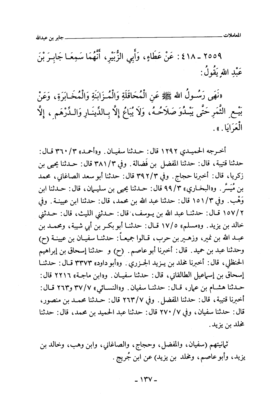 - وفي رواية: نَهَى رَسُولُ اللهِ صلى الله عليه وسلم عَنِ الْمُحَاقَلَةِ، وَالْمُزَابَنَةِ، وَالْمُخَابَرَةِ، وَعَنْ بَيْعِ الثَّمَرِ حَتَّى يَبْدُوَ صَلَاحُهُ، وَلَا يُبَاعُ إِلَاّ بِالدِّينَارِ وَالدِّرْهَمِ، إِلَاّ الْعَرَايَا.