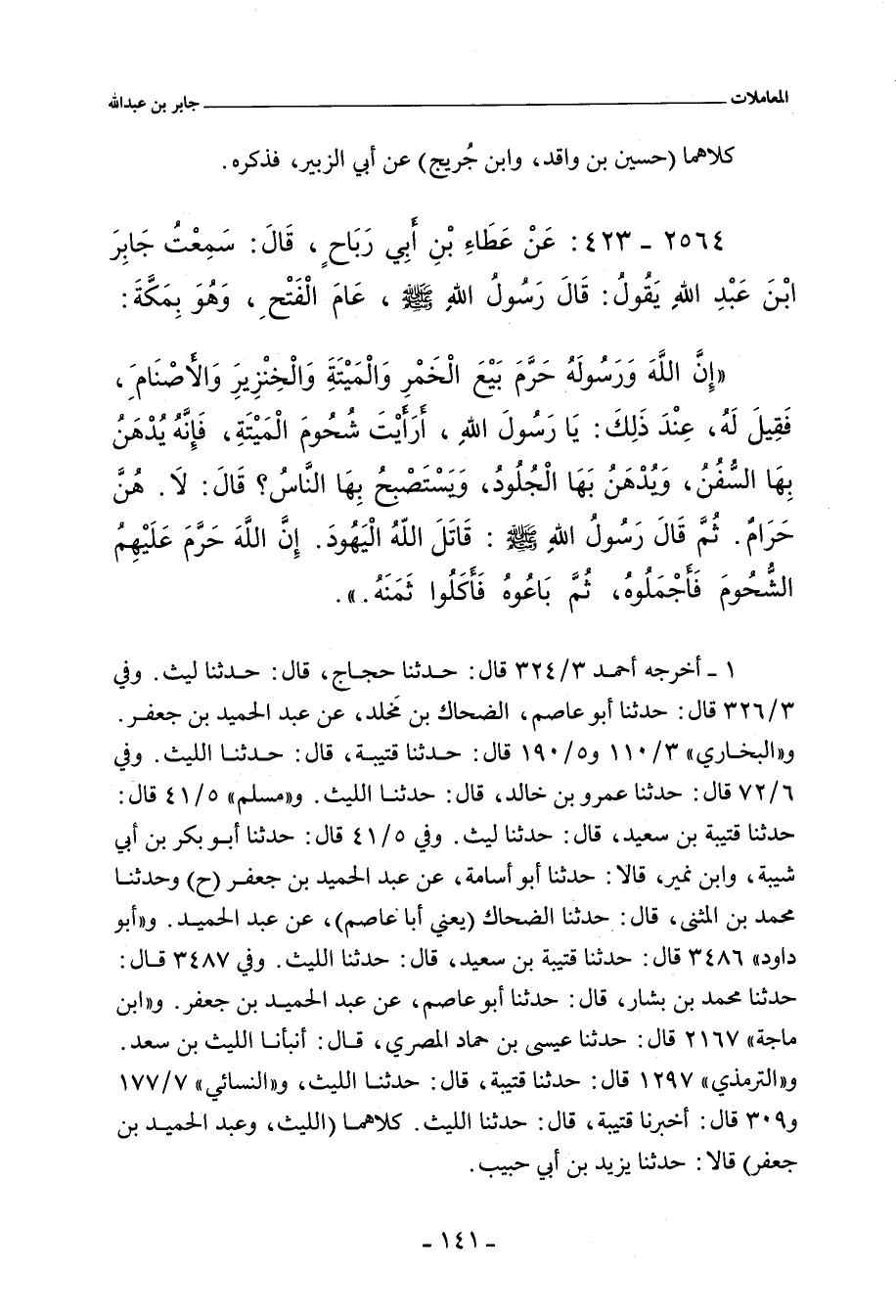 إِنَّ اللهَ، عَزَّ وَجَلَّ، وَرَسُولَهُ، حَرَّمَ بَيْعَ الْخَمْرِ، وَالْمَيْتَةِ، وَالْخِنْزِيرِ، وَالأَصْنَامِ، فَقِيلَ لَهُ عِنْدَ ذَلِكَ: يَا رَسُولَ اللهِ، أَرَأَيْتَ شُحُومَ الْمَيْتَةِ، فَإِنَّهُ يُدْهَنُ بِهَا السُّفُنُ، وَيُدْهَنُ بِهَا الْجُلُودُ، وَيَسْتَصْبِحُ بِهَا النَّاسُ؟ قَالَ: لَا، هُوَ حَرَامٌ، ثُمَّ قَالَ رَسُولُ اللهِ صلى الله عليه وسلم عِنْدَ ذَلِكَ: قَاتَلَ اللهُ الْيَهُودَ، إِنَّ اللهَ، عَزَّ وَجَلَّ، لَمَّا حَرَّمَ عَلَيْهَا الشُّحُومَ جَمَّلُوهَا، ثُمَّ بَاعُوهَا، وَأَكَلُوا أَثْمَانَهَا.