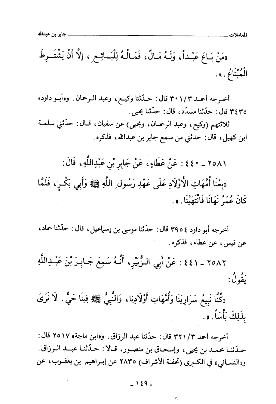 - وفي رواية: كُنَّا نَبِيعُ أُمَّهَاتِ الأَوْلَادِ، عَلَى عَهْدِ رَسُولِ اللهِ صلى الله عليه وسلم، فَلَا يُنْكَرُ ذَلِكَ عَلَيْنَا.