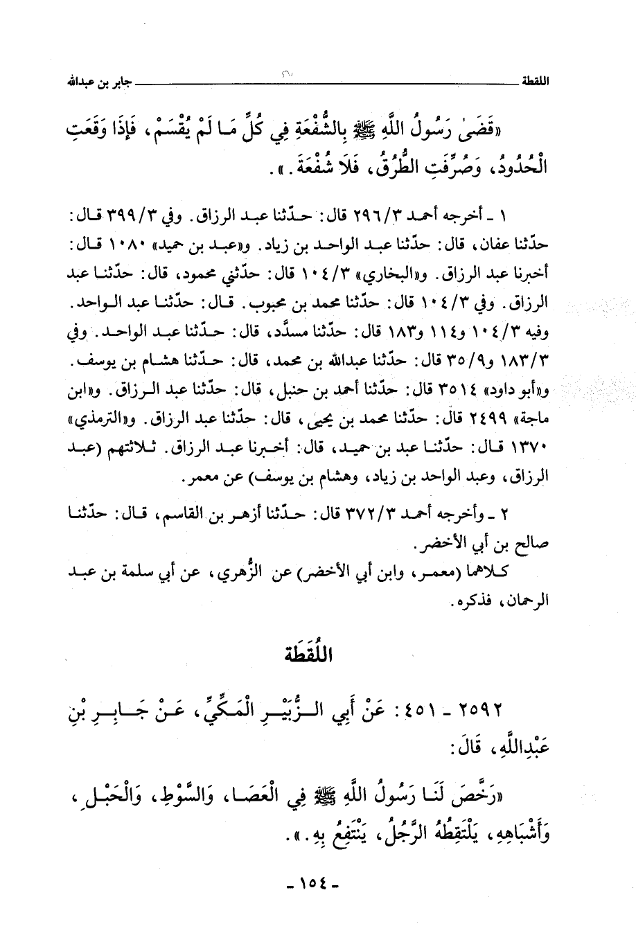 ١ - أخرجه أحمد ٣/ ٢٩٦ (١٤٢٠٤) قال: حدَّثنا عَبْد الرَّزَّاق. وفي ٣/ ٣٩٩ (١٥٣٦٣) قال: حدَّثنا عَفَّان، حدَّثنا عَبْد الواحد بن زِيَاد. و"عَبد بن حُميد" ١٠٨٠ قال: أخبرنا عَبْد الرَّزَّاق. و"البُخَارِي" (٢٢١٣) قال: حدَّثني محمود، حدَّثنا عَبْد الرَّزَّاق. وفي (٢٢١٤) قال: حدَّثنا مُحَمد بن مَحْبُوب , حدَّثنا عَبْد الواحد. وفي (٢٢١٤ م و ٢٢٥٧ و ٢٤٩٦) قال: حدَّثنا مُسَدَّد، حدَّثنا عَبْد الواحد. وفي (٢٤٩٥ و ٦٩٧٦) قال: حدَّثنا عَبْد اللهِ بن مُحَمد، حدَّثنا هِشَام بن يُوسُف. و"أبو داود" ٣٥١٤ قال: حدَّثنا أحمد بن حَنْبَل، حدَّثنا عَبْد الرَّزَّاق. و"ابن ماجة" ٢٤٩٩ قال: حدَّثنا مُحَمد بن يَحيى، حدَّثنا عَبْد الرَّزَّاق. والتِّرْمِذِيّ" ١٣٧٠ قال: حدَّثنا عَبْد بن حُمَيْد، أخبرنا عَبْد الرَّزَّاق.