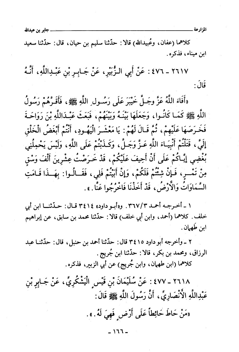 - لفظ ابن جُرَيْج: عَنْ جَابِرٍ، قَالَ: خَرَصَهَا ابْنُ رَوَاحَةَ أَرْبَعِينَ أَلْفَ وَسْقٍ، وَزَعَمَ أَنَّ الْيَهُودَ لَمَّا خَيَّرَهُمْ ابْنُ رَوَاحَةَ أَخَذُوا الثَّمَرَ وَعَلَيْهِمْ عِشْرُونَ أَلْفَ وَسْقٍ.