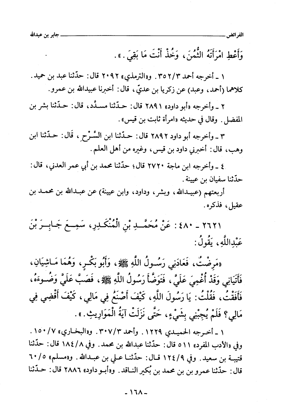 مَرِضْتُ، فَعَادَنِي رَسُولُ اللهِ صلى الله عليه وسلم، وَأَبُو بَكْرٍ، وَهُمَا يَمْشِيَانِ، فَأُغْمِي عَلَيَّ، فَدَعَا رَسُولُ اللهِ صلى الله عليه وسلم بِمَاءٍ فَتَوَضَّأَ، ثُمَّ صَبَّهُ عَلَيَّ فَأَفَقْتُ، فَقَُلْتُ: يَا رَسُولَ اللهِ، كَيَفَ أَقْضِي فِي مَالِي، كَيْفَ أَصْنَعُ فِي مَالِي؟ فَسَكَتَ رَسُولُ اللهِ صلى الله عليه وسلم، حَتَّى نَزَلَتْ آيَةُ الْمِيرَاثِ.