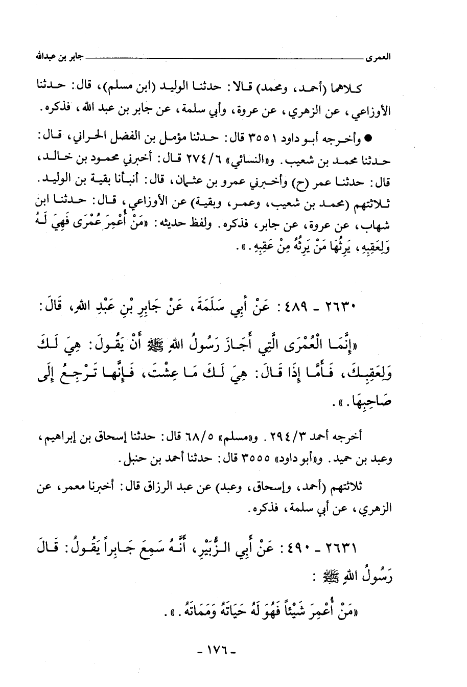 كلاهما (أحمد , ومُحَمد) عن الوَلِيد بن مُسْلم، قال: حدَّثنا الأَوْزَاعِي، عن الزُّهْرِي، عن عُرْوَة، وأَبي سَلَمَة، عَنْ جَابِرٍ، قَالَ: قَالَ رَسُولُ اللهِ صلى الله عليه وسلم: