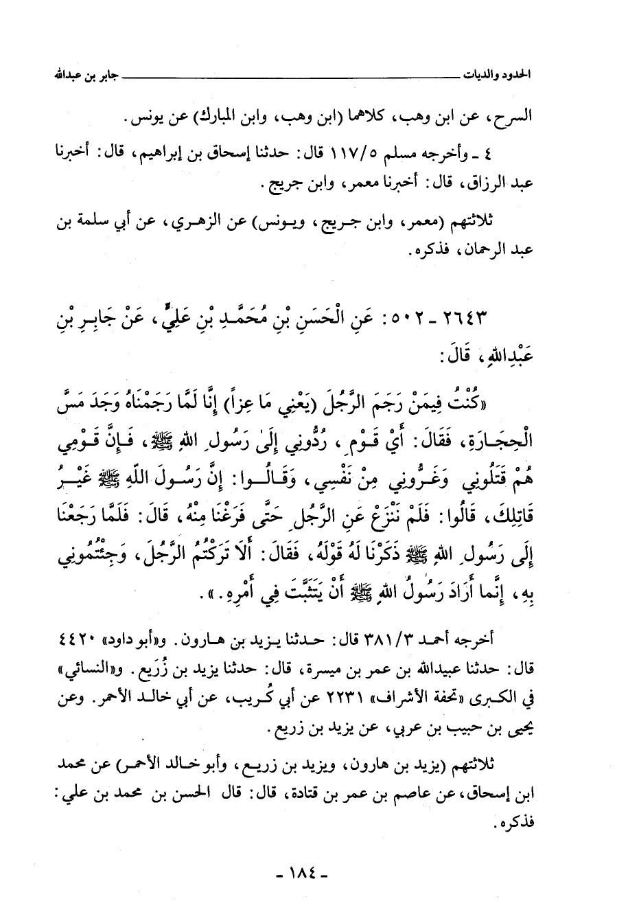 - لفظ يَزِيد بن هارون: عَنْ مُحَمَّدِ بْنِ إِسْحَاقَ، عَنْ عَاصِمِ بْنِ عُمَرَ بْنِ قَتَادَةَ، قَالَ: قَالَ الْحَسَنُ بْنُ مُحَمَّدِ بْنِ عَلِيٍّ: قُلْتُ لِجَابِرِ بْنِ عَبْدِ اللهِ، فَقَالَ جَابِرُ بْنُ عَبْدِ اللهِ: يَا ابْنَ أَخِي أَنَا أَعْلَمُ النَّاسِ بِهَذَا الْحَدِيثِ، كُنْتُ فِيمَنْ رَجَمَ الرَّجُلَ، يَعْنِي مَاعِزًا، إِنَّا لَمَّا رَجَمْنَاهُ وَجَدَ مَسَّ الْحِجَارَةِ، فَقَالَ: أَيْ قَوْمِ رُدُّونِي إِلَى رَسُولِ اللهِ صلى الله عليه وسلم، فَإِنَّ قَوْمِي هُمْ قَتَلُونِي وَغَرُّونِي مِنْ نَفْسِي، وَقَالُوا: إِنَّ رَسُولَ اللهِ صلى الله عليه وسلم غَيْرُ قَاتِلِكَ، قَالَ: فَلَمْ نَنْزِعْ عَنِ الرَّجُلِ حَتَّى فَرَغْنَا مِنْهُ، قَالَ: فَلَمَّا رَجَعْنَا إِلَى رَسُولِ اللهِ صلى الله عليه وسلم ذَكَرْنَا لَهُ قَوْلَهُ، فَقَالَ: أَلَا تَرَكْتُمُ الرَّجُلَ وَجِئْتُمُونِي بِهِ، إِنَّمَا أَرَادَ رَسُولُ اللهِ صلى الله عليه وسلم أَنْ يَتَثَبَّتَ فِي أَمْرِهِ.