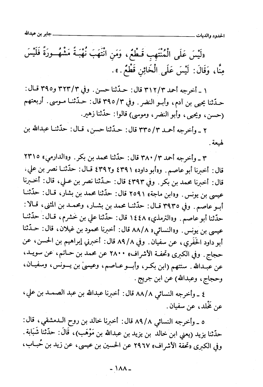 - لفظ مُحَمد بن عُبَيْد اللهِ: لَيْسَ عَلَى مُنْتَهِبٍ، وَلَا مُخْتَلِسٍ، وَلَا خَائِنٍ قَطْعٌ.