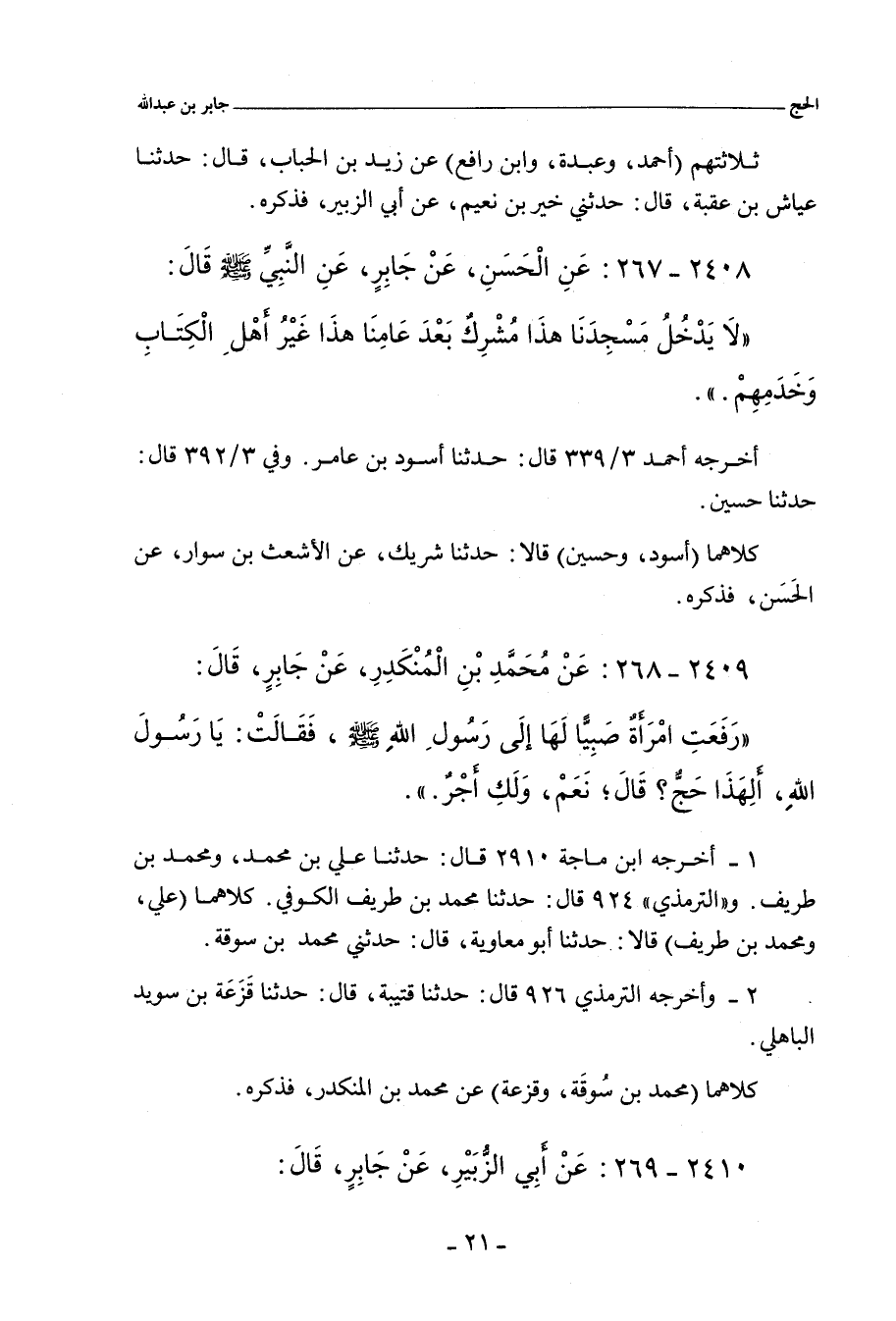 ٢٤٠٩ - عَنْ مُحَمَّدِ بْنِ الْمُنْكَدِرِ، عَنْ جَابِرِ بْنِ عَبْدِ اللهِ، قَالَ:
