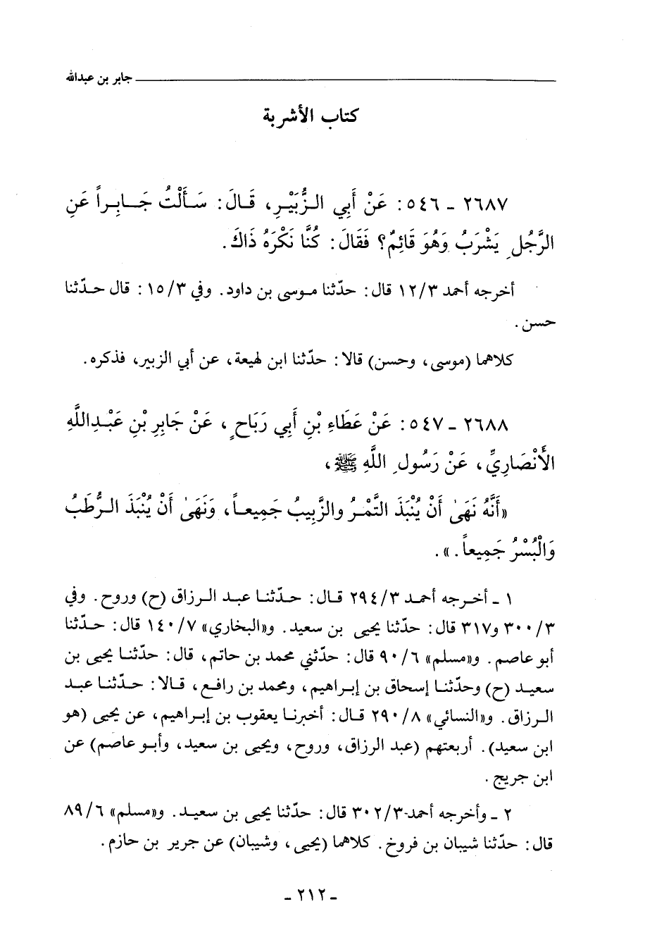 ٢٦٨٧ - عَنْ أَبِي الزُّبَيْرِ، قَالَ: سَأَلْتُ جَابِرًا عَنِ الرَّجُلِ يشْرَبُ وَهُوَ قَائِمٌ؟ قَالَ جَابِرٌ: كُنَّا نَكْرَهُ ذَلِكَ.