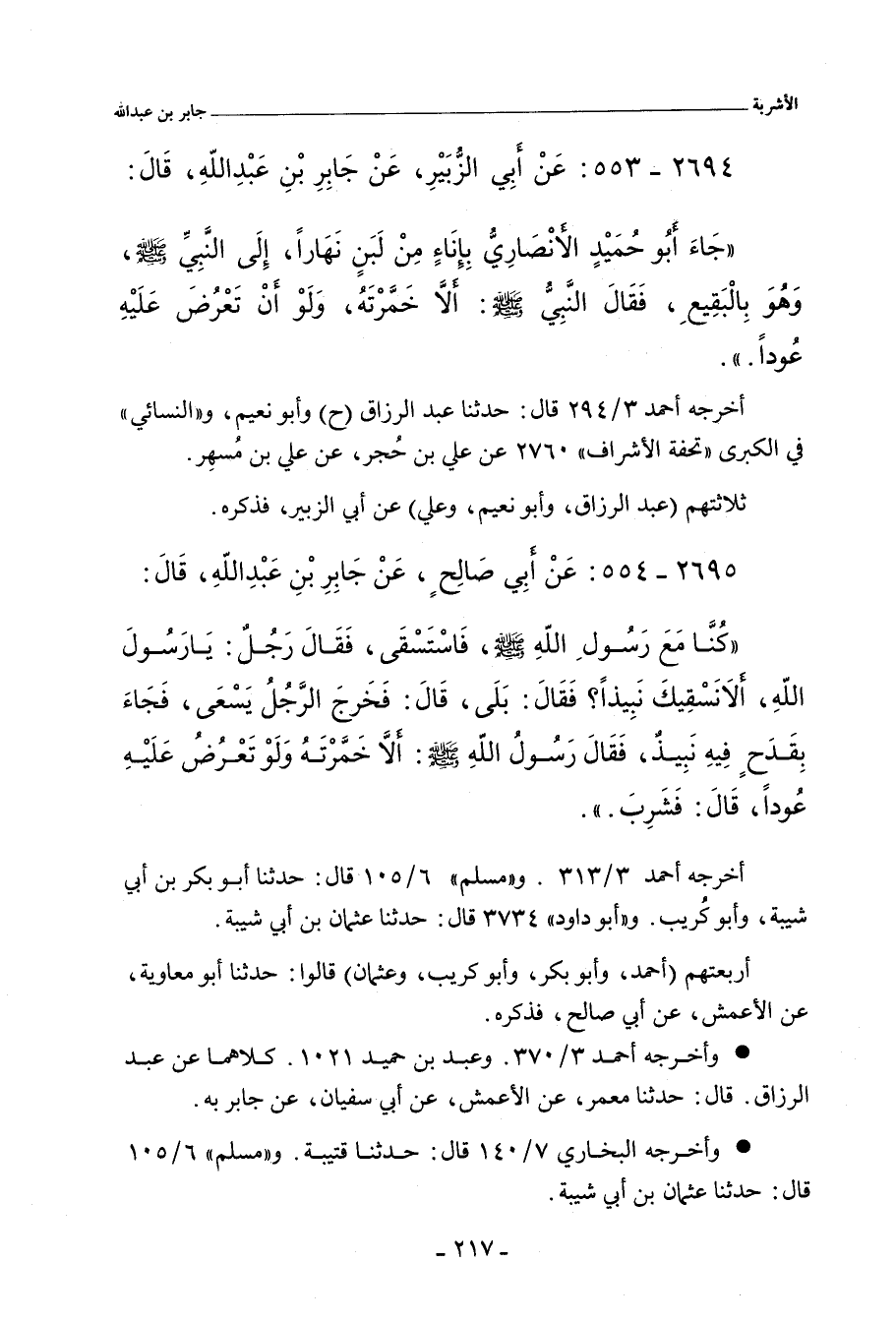 - لفظ وَكِيع: أَنَّ أَبَا حُمَيْدٍ أَتَى النَّبِيَّ صلى الله عليه وسلم بِشَرَابٍ، وَهُوَ فِي الْبَقِيعِ، فَقَالَ: أَلَا خَمَّرْتَهُ، وَلَوْ تَعْرِضُ عَلَيْهِ عُودًا.