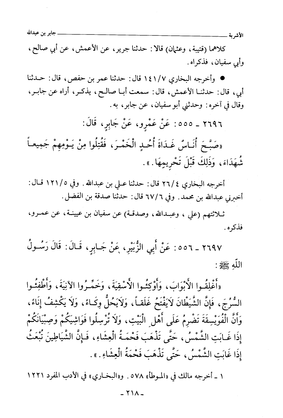 أَغْلِقُوا الأَبْوَابَ، وَأَوْكُوا الأَسْقِيَةَ، وَخَمِّرُوا الآنِيَةَ، وَأَطْفِئُوا السُّرُجَ، فَإِنَّ الشَّيْطَانَ لَا يَفْتَحُ غَلَقًا، وَلَا يَحُلُّ وِكَاءً، وَلَا يَكْشِفُ إِنَاءً، وَإِنَّ الْفُوَيْسِقَةَ تُضْرِمُ عَلَى أَهْلِ الْبَيْتِ، وَلَا تُرْسِلُوا فَوَاشِيَكُمْ وَصِبْيَانَكُمْ إِذَا غَابَتِ الشَّمْسُ، حَتَّى تَذْهَبَ فَحْمَةُ الْعِشَاءِ، فَإِنَّ الشَّيَاطِينَ تُبْعَثُ إِذَا غَابَتِ الشَّمْسُ، حَتَّى تَذْهَبَ فَحْمَةُ الْعِشَاءِ.