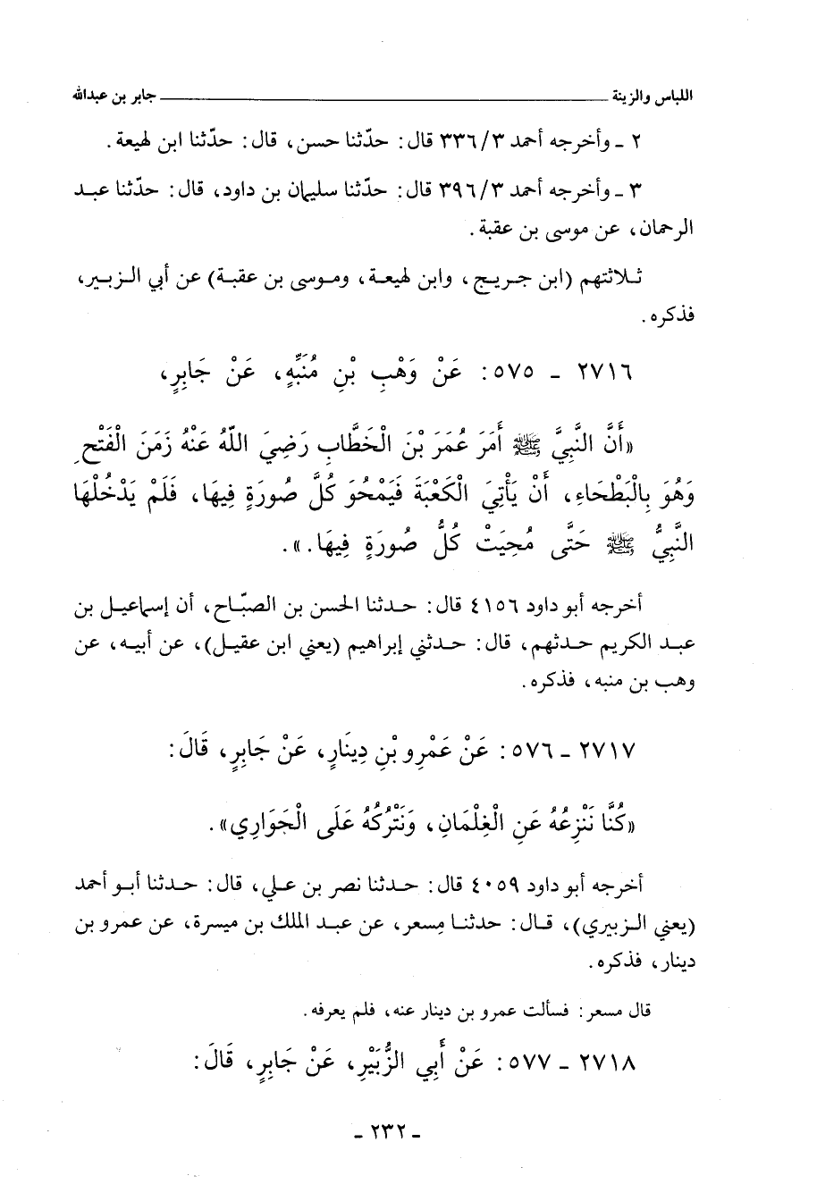 أَنَّ النَّبِيَّ صلى الله عليه وسلم أَمَرَ عُمَرَ بْنَ الْخَطَّابِ، رَضِيَ اللهُ عَنْهُ، زَمَنَ الْفَتْحِ، وَهُوَ بِالْبَطْحَاءِ، أَنْ يَأْتِيَ الْكَعْبَةَ فَيَمْحُوَ كُلَّ صُورَةٍ فِيهَا، فَلَمْ يَدْخُلْهَا النَّبِيُّ صلى الله عليه وسلم حَتَّى مُحِيَتْ كُلُّ صُورَةٍ فِيهَا.