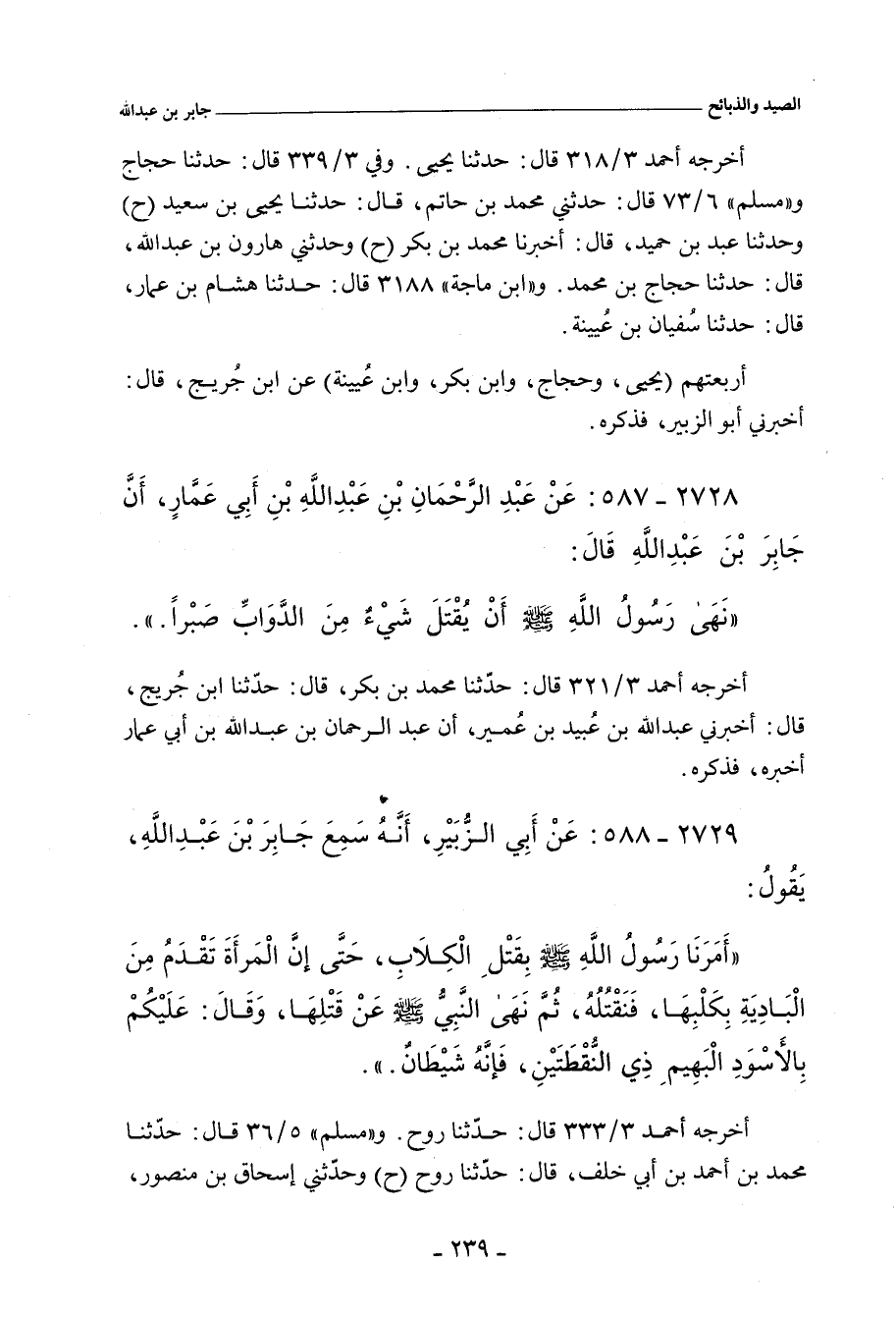 أَنَّ النَّبِيَّ صلى الله عليه وسلم أَمَرَ بِقَتْلِ الْكِلَابِ، حَتَّى إِنَّ الْمَرْأَةَ كَانَتْ تَدْخُلُ بِالْكَلْبِ، فَيُقْتَلُ قَبْلَ أَنْ تَخْرُجَ، (ثُمَّ) قَالَ: لَوْلَا أَنَّ الْكِلَابَ أُمَّةٌ مِنْ الأُمَمِ لأَمَرْتُ بِقَتْلِهَا، فَاقْتُلُوا مِنْهَا كُلَّ أَسْوَدَ بَهِيمٍ، الَّذِي بَيْنَ عَيْنَيْهِ نُقْطَتَانِ، فَإِنَّهُ شَيْطَانٌ.