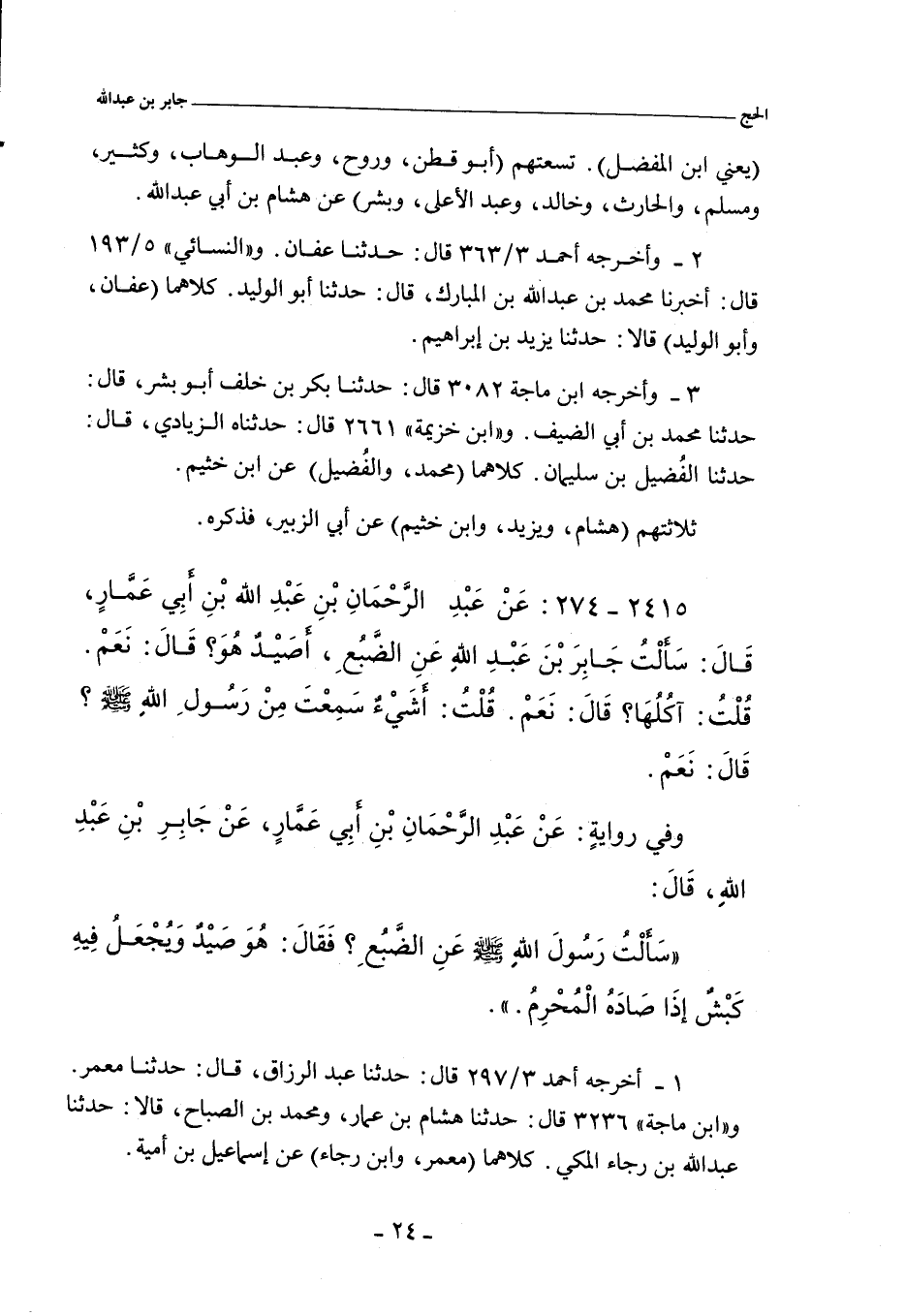 ٢٤١٥ - عَنْ عَبْدِ الرَّحْمَانِ بْنِ عَبْدِ اللهِ بْنِ أَبِي عَمَّارٍ، قَالَ: سَأَلْتُ جَابِرًا، فَقُلْتُ: الضَّبُعَ آكُلُهَا؟ قَالَ: نَعَمْ، قَالَ: قُلْتُ: أَصَيْدٌ هِيَ؟ قَالَ: نَعَمْ، قُلْتُ: أَسَمِعْتَ ذَاكَ مِنْ نَبِيِّ اللهِ صلى الله عليه وسلم؟ قَالَ: نَعَمْ.