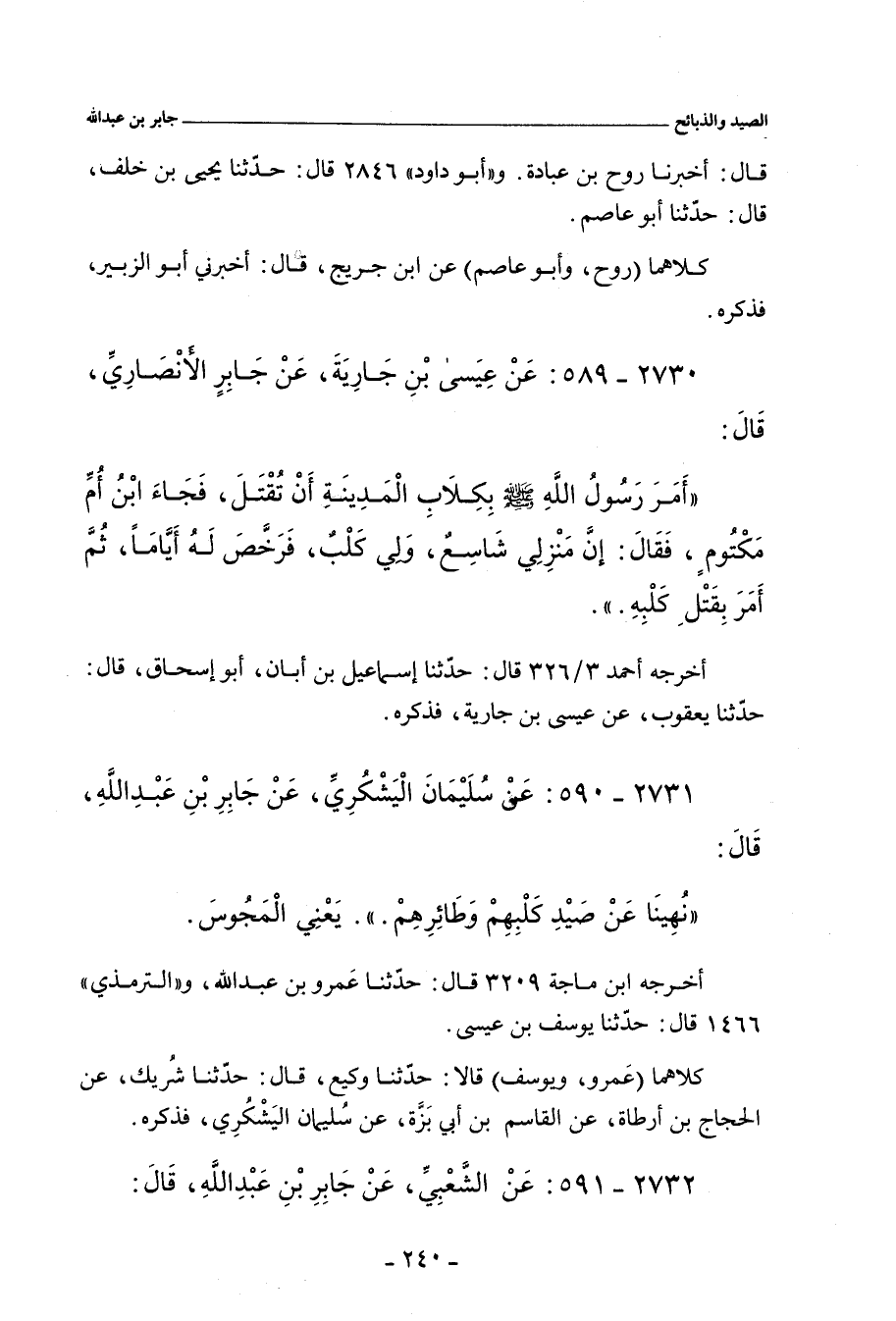 ٢٧٣٠ - عَنْ عِيسَى بْنِ جَارِيَةَ، عَنْ جَابِرٍ الأَنْصَارِيِّ، قَالَ: