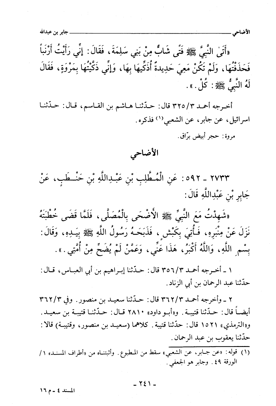 شَهِدْتُ مَعَ رَسُولِ اللهِ صلى الله عليه وسلم الأَضْحَى بِالْمُصَلَّى، فَلَمَّا قَضَى خُطْبَتَهُ نَزَلَ مِنْ مِنْبَرِهِ، وَأُتِيَ بِكَبْشٍ، فَذَبَحَهُ رَسُولُ اللهِ صلى الله عليه وسلم بِيَدِهِ، وَقَالَ: بِسْمِ اللهِ، وَاللهُ أَكْبَرُ، هَذَا عَنِّي، وَعَمَّنْ لَمْ يُضَحِّ مِنْ أُمَّتِي.