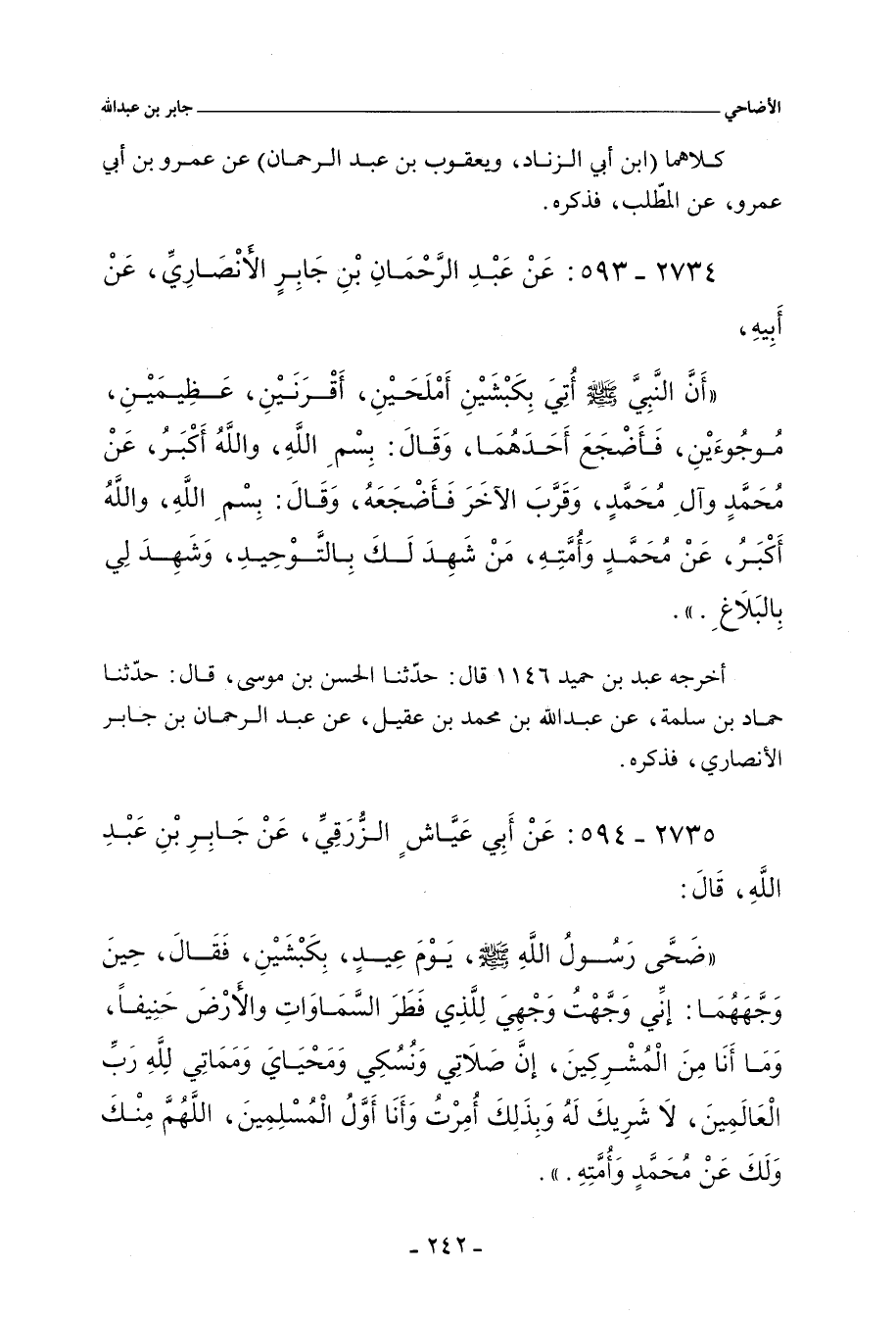 أَنَّ النَّبِيَّ صلى الله عليه وسلم أُتِيَ بِكَبْشَيْنِ أَمْلَحَيْنِ، أَقْرَنَيْنِ، عَظِيمَيْنِ، مُوجِبَيْنِ، فَأَضْجَعَ أَحَدَهُمَا، وَقَالَ: بِسْمِ اللهِ، وَاللهُ أَكْبَرُ، اللَّهُمَّ عَنْ مُحَمَّدٍ، وَآلِ مُحَمَّدٍ، وَقَرَّبَ الآخَرَ فَأَضْجَعَهُ، وَقَالَ: بِسْمِ اللهِ، وَاللهُ أَكْبَرُ، عَنْ مُحَمَّدٍ، وَأُمَّتِهِ، مَنْ شَهِدَ لَكَ بِالتَّوْحِيدِ، وَشَهِدَ لِيَ بِالْبَلَاغِ.