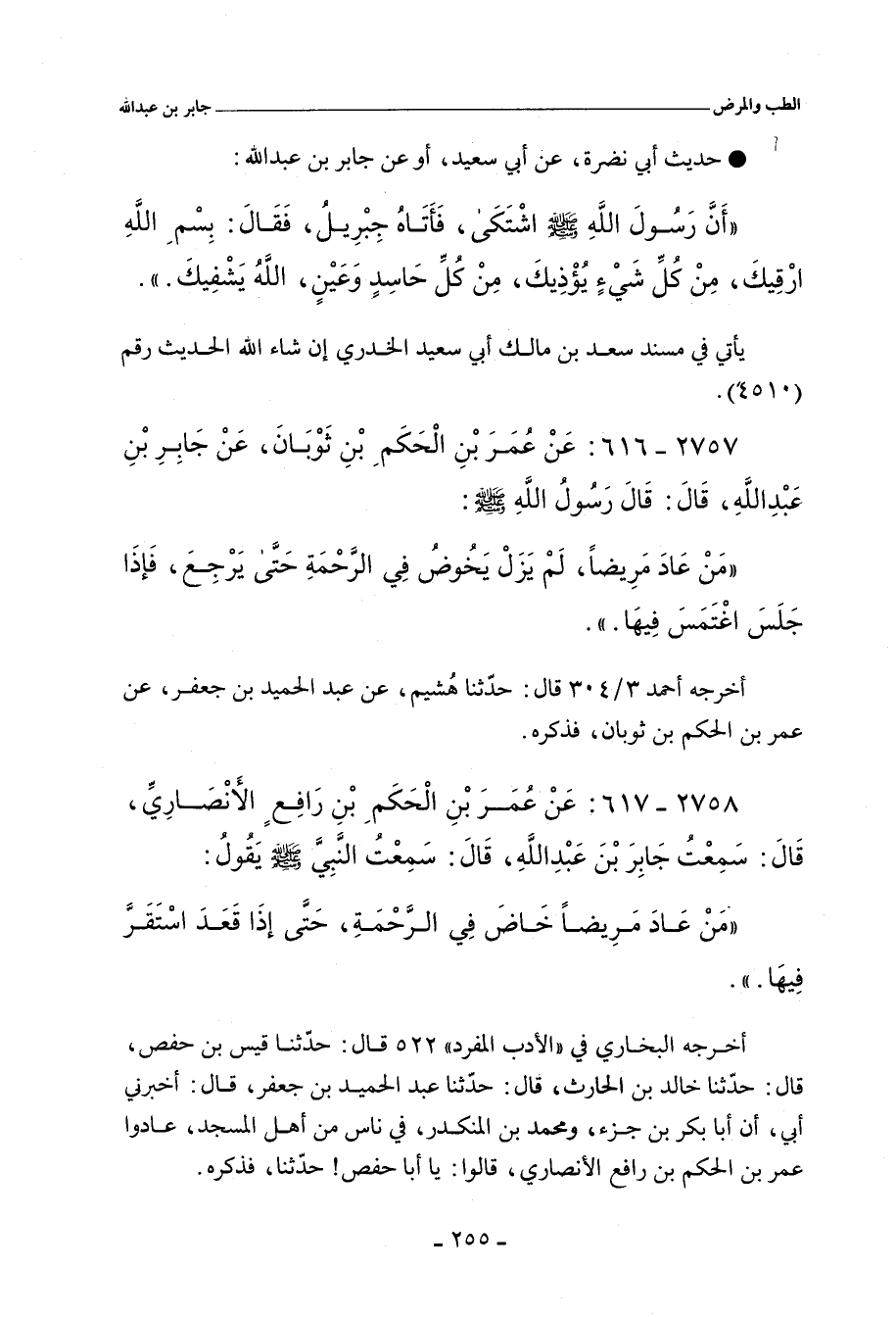 أخرجه البُخَارِي، في (الأدب المفرد) ٥٢٢ قال: حدَّثنا قَيْس بن حَفْص، قال: حدَّثنا خالد بن الحارث، قال: حدَّثنا عَبْد الحميد بن جَعْفَر، قال: أخبرني أَبي، أن أبا بَكْر بن جَزْء، ومُحَمد بن المُنْكَدِر، في ناسٍ من أهل المَسْجد، عادوا عُمَر بن الحَكَم بن رافع الأَنْصَارِي، قالوا: يا أبا حَفْص، حدِّثنا، فذكره.