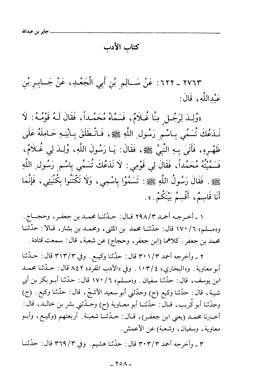 ٢٧٦٣ - عَنْ سَالِمِ بْنِ أَبِي الْجَعْدِ، عَنْ جَابِرِ بْنِ عَبْدِ اللهِ، قَالَ: