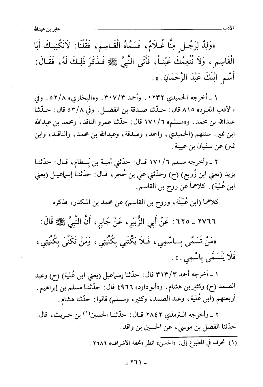 - وفي رواية: وُلِدَ لِرَجُلٍ مِنَّا غُلَامٌ، فَسَمَّاهُ الْقَاسِمَ، فَقُلْنَا: لَا نَكْنِيكَ أَبَا الْقَاسِمِ، وَلَا كَرَامَةَ، فَأَخْبَرَ النَّبِيَّ صلى الله عليه وسلم، فَقَالَ: سَمِّ ابْنَكَ عَبْدَ الرَّحْمَانِ.