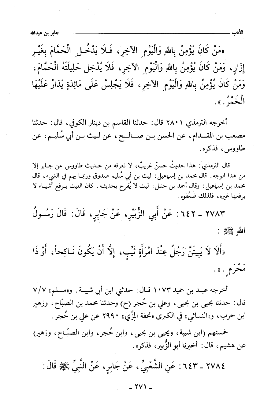 - قال أبو عِيسَى التِّرْمِذِي: هذا حديثٌ حَسَن غريبٌ، لا نعرفُه من حديث طاوُوس، عن جابرٍ، إلا من هذا الوجه. قال مُحَمد بن إِسْمَاعِيل: لَيْث بن أَبي سُلَيْم صَدُوقٌ ورُبما يَهِمُ في الشيءِ، وقال مُحَمد بن إِسْمَاعِيل: قال أحمد بن حَنْبَل: لَيْث لا يُفْرَحُ بحديثهِ. كان لَيْث يرفع أشياء لا يرفعها غيره، فلذلك ضَعَّفُوهُ.