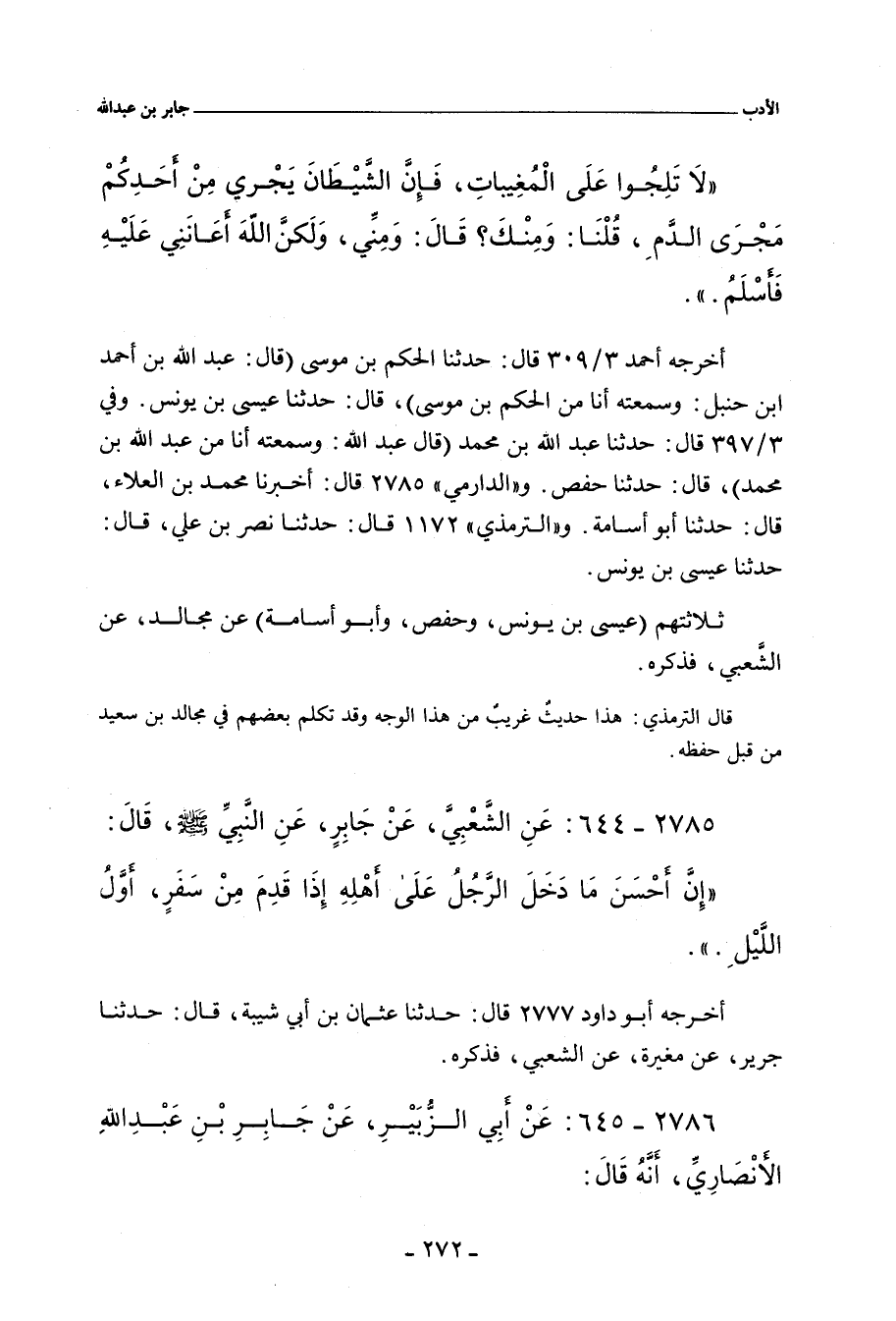 لَا تَلِجُوا عَلَى الْمُغِيبَاتِ، فَإِنَّ الشَّيْطَانَ يَجْرِي مِنْ أَحَدِكُمْ مَجْرَى الدَّمِ. قُلْنَا: وَمِنْكَ؟ قَالَ: وَمِنِّي، وَلَكِنَّ اللهَ أَعَانَنِي عَلَيْهِ فَأَسْلَمَُ.