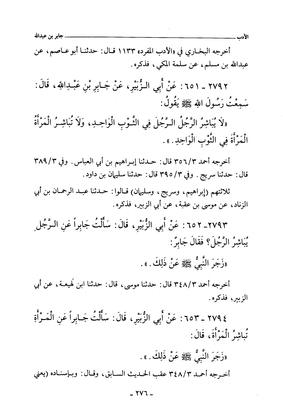 ٢٧٩٣ - عَنْ أَبِي الزُّبَيْرِ، قَالَ: سَأَلْتُ جَابِرًا عَنِ الرَّجُلِ يُبَاشِرُ الرَّجُلَ؟ فَقَالَ جَابِرٌ: