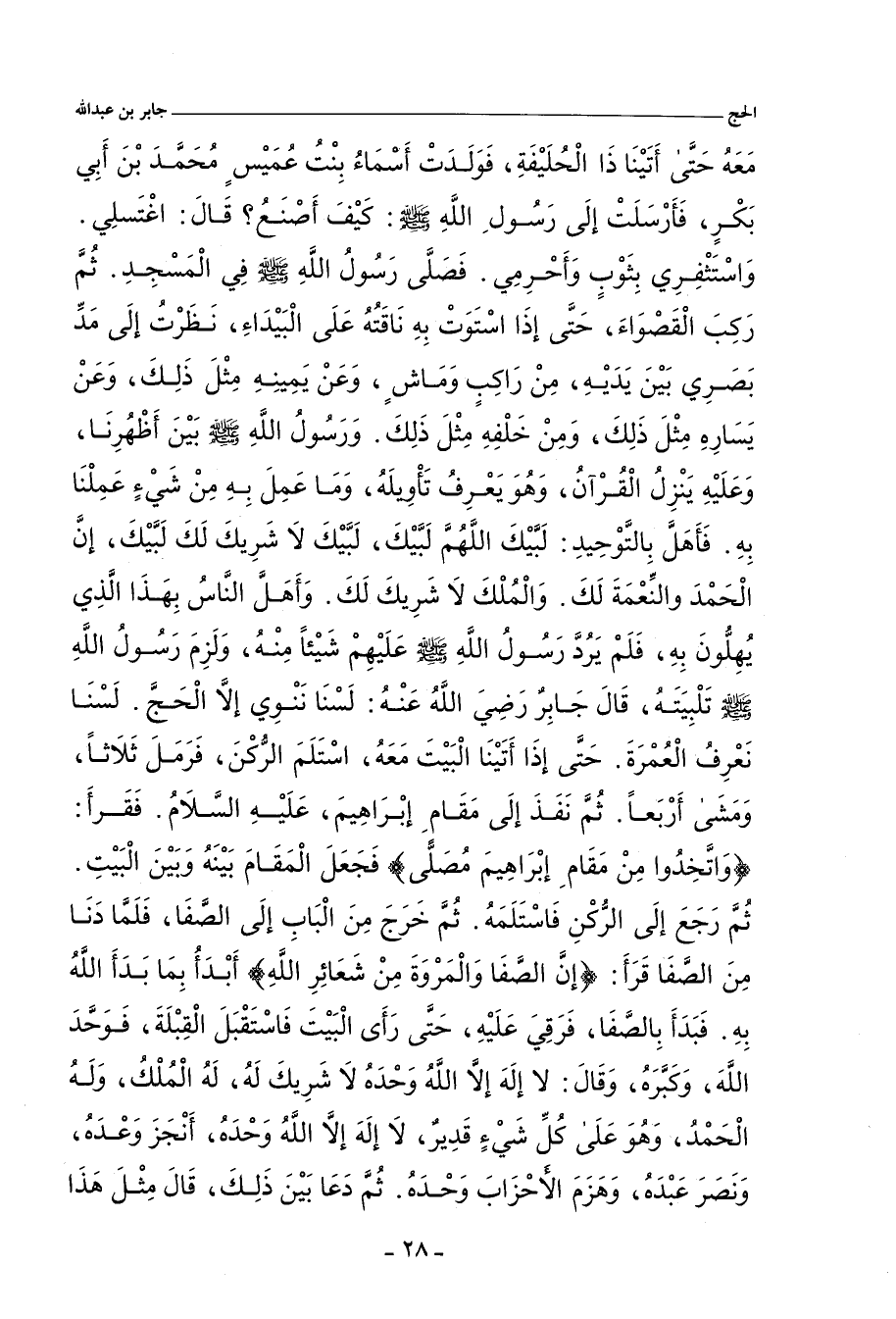 مَعَهُ حَتَّى أَتَيْنَا ذَا الْحُلَيْفَةِ، فَوَلَدَتْ أَسْمَاءُ بِنْتُ عُمَيْسٍ مُحَمَّدَ بْنَ أَبِي بَكْرٍ، فَأَرْسَلَتْ إِلَى رَسُولِ اللهِ صلى الله عليه وسلم: كَيْفَ أَصْنَعُ؟ قَالَ: اغْتَسِلِي، وَاسْتَثْفِرِي بِثَوْبٍ، وَأَحْرِمِي، فَصَلَّى رَسُولُ اللهِ صلى الله عليه وسلم فِي الْمَسْجِدِ، ثُمَّ رَكِبَ الْقَصْوَاءَ، حَتَّى إِذَا اسْتَوَتْ بِهِ نَاقَتُهُ عَلَى الْبَيْدَاءِ، نَظَرْتُ إِلَى مَدِّ بَصَرِي بَيْنَ يَدَيْهِ مِنْ رَاكِبٍ وَمَاشٍ، وَعَنْ يَمِينِهِ مِثْلَ ذَلِكَ، وَعَنْ يَسَارِهِ مِثْلَ ذَلِكَ، وَمِنْ خَلْفِهِ مِثْلَ ذَلِكَ، وَرَسُولُ اللهِ صلى الله عليه وسلم بَيْنَ أَظْهُرِنَا، وَعَلَيْهِ يَنْزِلُ الْقُرْآنُ، وَهُوَ يَعْرِفُ تَأْوِيلَهُ، وَمَا عَمِلَ بِهِ مِنْ شَيْءٍ عَمِلْنَا بِهِ، فَأَهَلَّ بِالتَّوْحِيدِ: لَبَّيْكَ اللَّهُمَّ لَبَّيْكَ، لَبَّيْكَ لَا شَرِيكَ لَكَ لَبَّيْكَ، إِنَّ الْحَمْدَ وَالنِّعْمَةَ لَكَ وَالْمُلْكَ، لَا شَرِيكَ لَكَ، وَأَهَلَّ النَّاسُ بِهَذَا الَّذِي يُهِلُّونَ بِهِ، فَلَمْ يَرُدَّ رَسُولُ اللهِ صلى الله عليه وسلم عَلَيْهِمْ شَيْئًا مِنْهُ، وَلَزِمَ رَسُولُ اللهِ صلى الله عليه وسلم تَلْبِيَتَهُ.