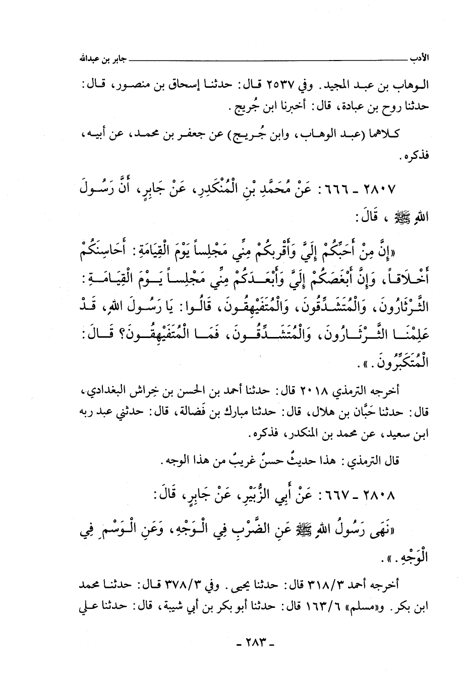 إِنَّ مِنْ أَحَبِّكُمْ إِلَيَّ، وَأَقْرَبِكُمْ مِنِّي مَجْلِسًا، يَوْمَ الْقِيَامَةِ: أَحَاسِنَكُمْ أَخْلَاقًا، وَإِنَّ أَبْغَضَكُمْ إِلَيَّ، وَأَبْعَدَكُمْ مِنِّي مَجْلِسًا، يَوْمَ الْقِيَامَةِ: الثَّرْثَارُونَ، وَالْمُتَشَدِّقُونَ، وَالْمُتَفَيْهِقُونَ، قَالُوا: يَا رَسُولَ اللهِ، قَدْ عَلِمْنَا الثَّرْثَارُونَ، وَالْمُتَشَدِّقُونَ، فَمَا الْمُتَفَيْهِقُونَ؟ قَالَ: الْمُتَكَبِّرُونَ.