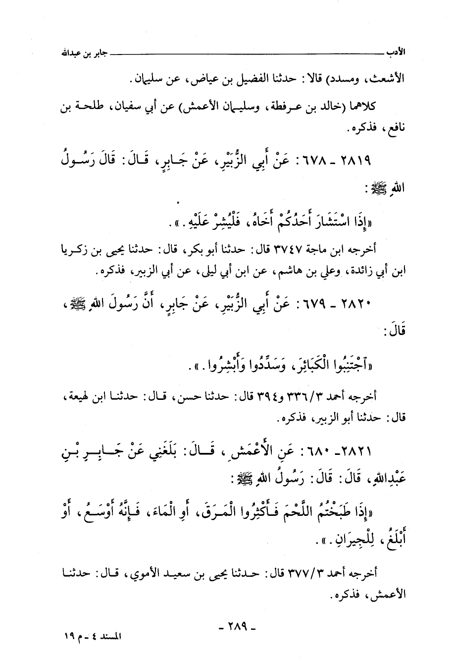 - قال ابنُ حَجَر: رواه أبو بَكْر بن أَبي شَيْبَة، عن أَبي مُعَاوِيَة، عن الأَعْمَش، عن بعض أصحابه، عن جابرٍ (أطراف المسند.