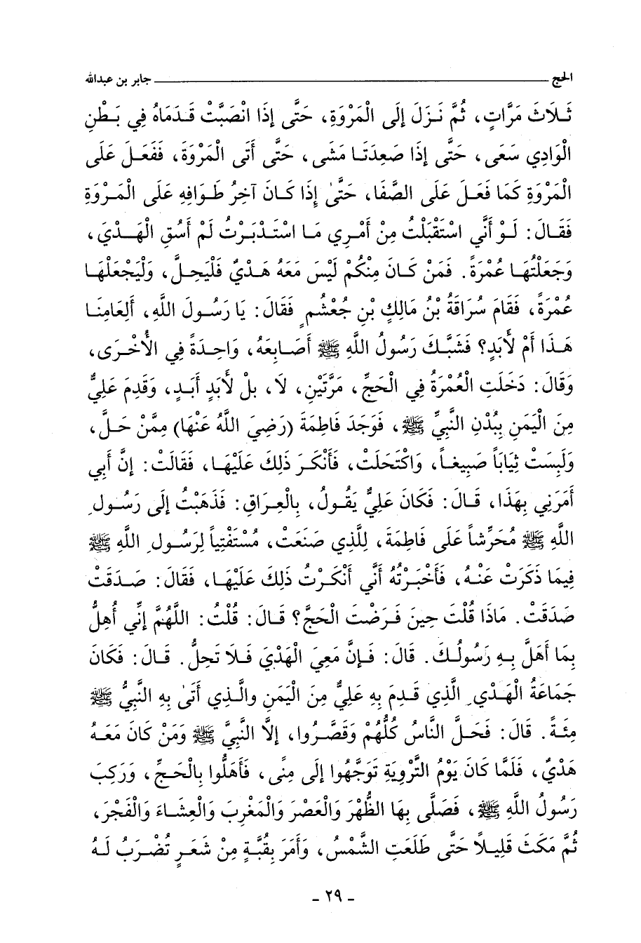 ثَلَاثَ مَرَّاتٍ، ثُمَّ نَزَلَ إِلَى الْمَرْوَةِ، حَتَّى إِذَا انْصَبَّتْ قَدَمَاهُ فِي بَطْنِ الْوَادِي سَعَى، حَتَّى إِذَا صَعِدَتَا مَشَى، حَتَّى أَتَى الْمَرْوَةَ، فَفَعَلَ عَلَى الْمَرْوَةِ كَمَا فَعَلَ عَلَى الصَّفَا، حَتَّى إِذَا كَانَ آخِرُ طَوَافِهِ عَلَى الْمَرْوَةِ، فَقَالَ: لَوْ أَنِّي اسْتَقْبَلْتُ مِنْ أَمْرِي مَا اسْتَدْبَرْتُ، لَمْ أَسُقِ الْهَدْيَ، وَجَعَلْتُهَا عُمْرَةً، فَمَنْ كَانَ مِنْكُمْ لَيْسَ مَعَهُ هَدْيٌ فَلْيَحِلَّ، وَلْيَجْعَلْهَا عُمْرَةً، فَقَامَ سُرَاقَةُ بْنُ مَالِكِ بْنِ جُعْشُمٍ، فَقَالَ: يَا رَسُولَ اللهِ، أَلِعَامِنَا هَذَا أَمْ لأَبَدٍ؟ فَشَبَّكَ رَسُولُ اللهِ صلى الله عليه وسلم أَصَابِعَهُ، وَاحِدَةً فِي الأُخْرَى، وَقَالَ: دَخَلَتِ الْعُمْرَةُ فِي الْحَجِّ، مَرَّتَيْنِ، لَا، بَلْ لأَبَدٍ أَبَدٍ.
