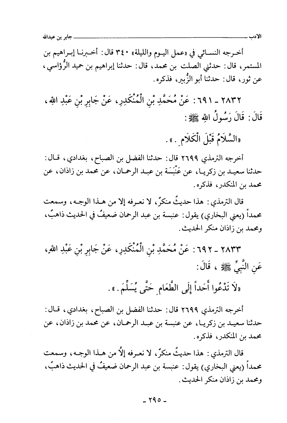 أخرجه التِّرْمِذِي (٢٦٩٩) الفَضْل بن الصَّبَّاح، بَغْدَادِيٌّ، قال: حدَّثنا سَعِيد بن زكريا، عن عَنْبَسَة بن عَبْد الرَّحْمان، عن مُحَمد بن زاذان، عن مُحَمد بن المُنْكَدِر، فذكره.