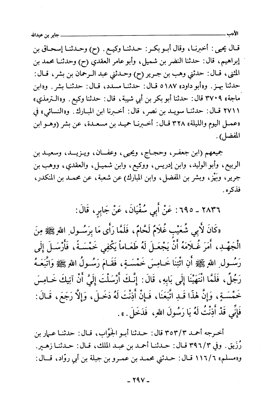 قال يَحيى: أخبرنا، وقال أبو بَكْر: حدَّثنا وَكِيع. وفي (٥٦٨٨) قال: وحدَّثنا إِسْحَاق بن إبراهيم، حدَّثنا النَّضْر بن شُمَيْل، وأبو عامر العَقَدِي (ح) وحدَّثنا مُحَمد بن المُثَنَّى، حدَّثني وَهْب بن جَرِير (ح) وحدَّثني عَبْد الرَّحْمان بن بِشْر، حدَّثنا بَهْز. و"أبو داود" ٥١٨٧ قال: حدَّثنا مُسَدَّد، حدَّثنا بِشْر. و"ابن ماجة" ٣٧٠٩ قال: حدَّثنا أبو بَكْر بن أَبي شَيْبَة، حدَّثنا وَكِيع. والتِّرْمِذِيّ" ٢٧١١ قال: حدَّثنا سُوَيْد بن نَصْر، أخبرنا ابن المُبَارك. و"النَّسائي"، في "عمل اليوم والليلة" ٣٢٨ قال: أخبرنا حُمَيْد بن مَسْعَدَة، عن بِشْر، وهو ابن المُفَضَّل.