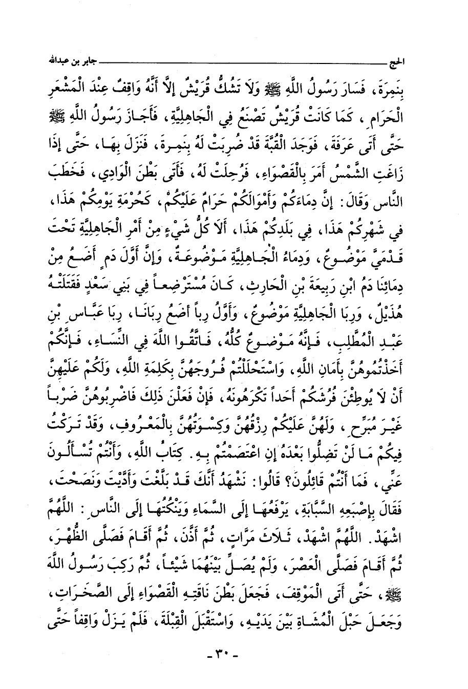 بِنَمِرَةَ، فَسَارَ رَسُولُ اللهِ صلى الله عليه وسلم، وَلَا تَشُكُّ قُرَيْشٌ إِلَاّ أَنَّهُ وَاقِفٌ عِنْدَ الْمَشْعَرِ الْحَرَامِ، كَمَا كَانَتْ قُرَيْشٌ تَصْنَعُ فِي الْجَاهِلِيَّةِ، فَأَجَازَ رَسُولُ اللهِ صلى الله عليه وسلم حَتَّى أَتَى عَرَفَةَ، فَوَجَدَ الْقُبَّةَ قَدْ ضُرِبَتْ لَهُ بِنَمِرَةَ، فَنَزَلَ بِهَا، حَتَّى إِذَا زَاغَتِ الشَّمْسُ أَمَرَ بِالْقَصْوَاءِ، فَرُحِلَتْ لَهُ، فَأَتَى بَطْنَ الْوَادِي، فَخَطَبَ النَّاسَ، وَقَالَ: إِنَّ دِمَاءَكُمْ وَأَمْوَالَكُمْ حَرَامٌ عَلَيْكُمْ، كَحُرْمَةِ يَوْمِكُمْ هَذَا، فِي شَهْرِكُمْ هَذَا، فِي بَلَدِكُمْ هَذَا، أَلَا كُلُّ شَيْءٍ مِنْ أَمْرِ الْجَاهِلِيَّةِ تَحْتَ قَدَمَيَّ مَوْضُوعٌ، وَدِمَاءُ الْجَاهِلِيَّةِ مَوْضُوعَةٌ، وَإِنَّ أَوَّلَ دَمٍ أَضَعُ مِنْ دِمَائِنَا دَمُ ابْنِ رَبِيعَةَ بْنِ الْحَارِثِ، كَانَ مُسْتَرْضِعًا فِي بَنِي سَعْدٍ، فَقَتَلَتْهُ هُذَيْلٌ، وَرِبَا الْجَاهِلِيَّةِ مَوْضُوعٌ، وَأَوَّلُ رِبًا أَضَعُ رِبَانَا، رِبَا عَبَّاسِ بْنِ عَبْدِ الْمُطَّلِبِ، فَإِنَّهُ مَوْضُوعٌ كُلُّهُ، فَاتَّقُوا اللهَ فِي النِّسَاءِ، فَإِنَّكُمْ أَخَذْتُمُوهُنَّ بِأَمَانِ اللهِ، وَاسْتَحْلَلْتُمْ فُرُوجَهُنَّ بِكَلِمَةِ اللهِ، وَلَكُمْ عَلَيْهِنَّ أَنْ لَا يُوطِئْنَ فُرُشَكُمْ أَحَدًا تَكْرَهُونَهُ، فَإِنْ فَعَلْنَ ذَلِكَ فَاضْرِبُوهُنَّ ضَرْبًا غَيْرَ مُبَرِّحٍ، وَلَهُنَّ عَلَيْكُمْ