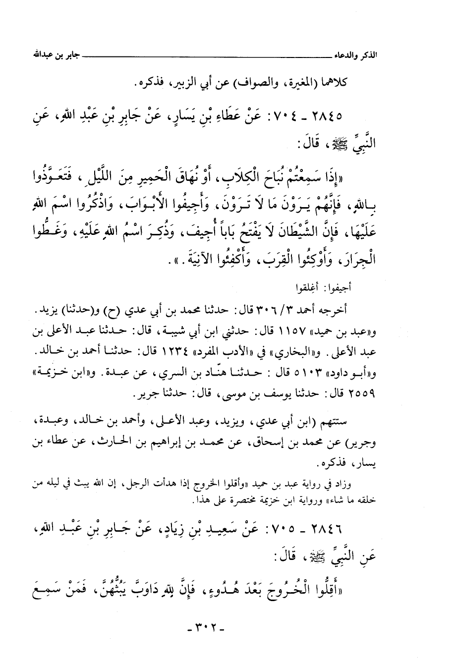 - وفي رواية: إِذَا سَمِعْتُمْ نُبَاحَ الْكِلَابِ، وَنَهِيقَ الْحُمُرِ، فَتَعَوَّذُوا بِاللهِ مِنَ الشَّيْطَانِ، فَإِنَّهُنًّ يَرَوْنَ مَا لَا تَرَوْنَ، وَأَقِلُّوا الْخُرُوجَ إِذَا هَدَأَتِ الرِّجْلُ، فَإِنَّ اللهَ يَبُثُّ فِي خَلْقِهِ فِي لَيْلِهِ مَا شَاءَ، وَأَجِيفُوا الأَبْوَابَ، فَإِنَّ الشَّيْطَانَ لَا يَفْتَحُ بَابًا إِذَا أُجِيفَ، وَأَوْكُوا الأَسْقِيَةَ، وَخَمِّرُوا الآنِيَةَ، وَأَطْفِئُوا السُّرُجَ.