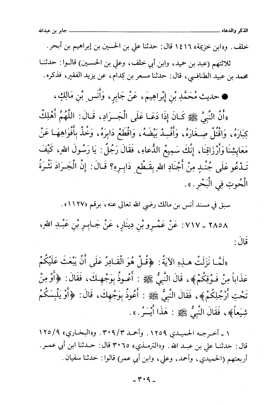 أَنَّ النَّبِيَّ صلى الله عليه وسلم كَانَ إِذَا دَعَا عَلَى الْجَرَادِ، قَالَ: اللَّهُمَّ أَهْلِكْ كِبَارَهُ، وَاقْتُلْ صِغَارَهُ، وَأَفْسِدْ بَيْضَهُ، وَاقْطَعْ دَابِرَهُ، وَخُذْ بِأَفْوَاهِهَا عَنْ مَعَايِشِنَا وَأَرْزَاقِنَا، إِنَّكَ سَمِيعُ الدُّعَاءِ، فَقَالَ رَجُلٌ: يَا رَسُولَ اللهِ، كَيْفَ تَدْعُو عَلَى جُنْدٍ مِنْ أَجْنَادِ اللهِ بِقَطْعِ دَابِرهِ؟ قَالَ: إِنَّ الْجَرَادَ نَثْرَةُ الْحُوتِ فِي الْبَحْرِ.