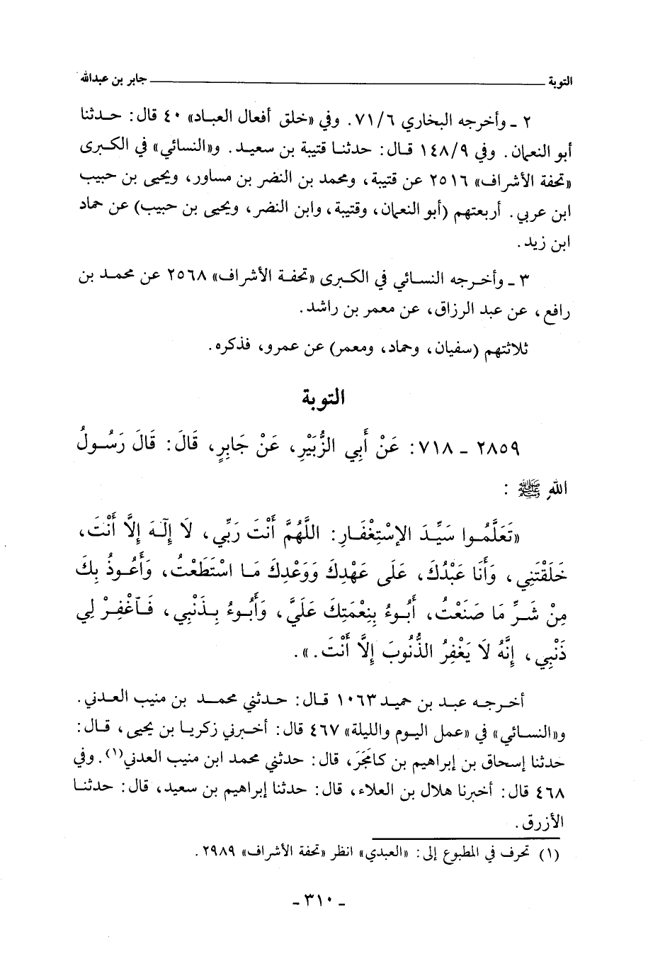 تَعَلَّمُوا سَيِّدَ الاِسْتِغْفَارِ: اللَّهُمَّ أَنْتَ رَبِّي، لَا إِلَهَ إِلَاّ أَنْتَ، خَلَقْتَنِي، وَأَنَا عَبْدُكَ، عَلَى عَهْدِكَ وَوَعْدِكَ مَا اسْتَطَعْتُ، وَأَعُوذُ بِكَ مِنْ شَرِّ مَا صَنَعْتُ، أَبُوءُ بِنِعْمَتِكَ عَلَيَّ، وَأَبُوءُ بِذَنْبِي، فَاغْفِرْ لِي ذَنْبِي، إِنَّهُ لَا يَغْفِرُ الذُّنُوبَ إِلَاّ أَنْتَ.