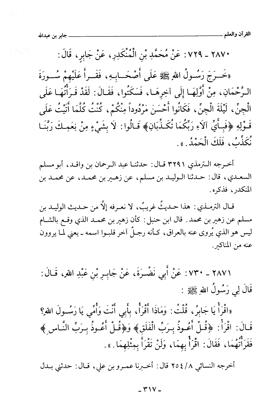 اقْرَأْ يَا جَابِرُ، قُلْتُ: وَمَاذَا أَقْرَأُ، بِأَبِي أَنْتَ وَأُمِّي، يَا رَسُولَ اللهِ؟ قَالَ: اقْرَأْ: (قُلْ أَعُوذُ بِرَبِّ الْفَلَقِ) وَ (قُلْ أَعُوذُ بِرَبِّ النَّاسِ) فَقَرَأْتُهُمَا، فَقَالَ: اقْرَأْ بِهِمَا، وَلَنْ تَقْرَأَ بِمِثْلِهِمَا.
