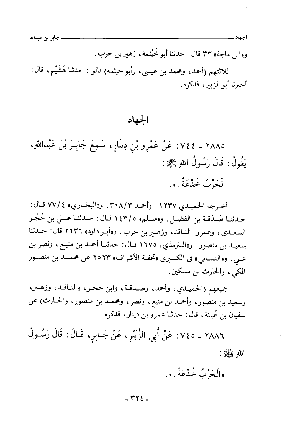 - وقال أبو عُثْمَان، عَمْرو بن مُحَمد النَّاقِد، في روايته عند أَبي يَعْلَى: قال لي بعضُ أصحابنا: كَثِير منهم كان يقول: (الحَرْب خَدعة) ولم أَسْمَعْهُ أنا إلا بالرفع: خُدعة.