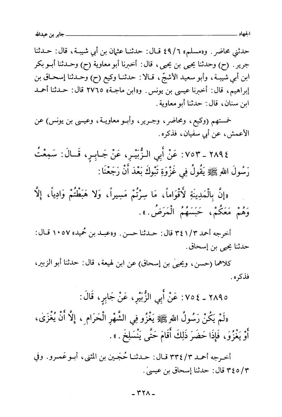 خمستهم (وَكِيع، ومُحَاضِر، وجَرِير، وأبو مُعَاوِيَة، وعِيسَى بن يُونُس) عن الأَعْمَش، عن أَبي سُفْيان، فذكره.