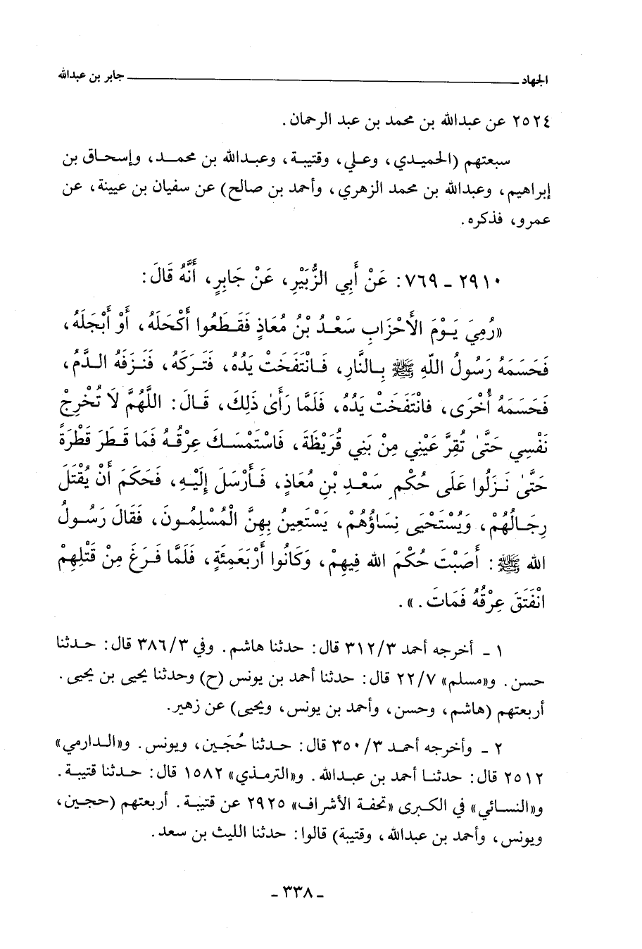 رُمِيَ يَوْمَ الأَحْزَابِ سَعْدُ بْنُ مُعَاذٍ، فَقَطَعُوا أَكْحَلَهُ، أَوْ أَبْجَلَهُ، فَحَسَمَهُ رَسُولُ اللهِ صلى الله عليه وسلم بِالنَّارِ، فَانْتَفَخَتْ يَدُهُ، فَتَرَكَهُ، فَنَزَفَهُ الدَّمُ، فَحَسَمَهُ أُخْرَى، فَانْتَفَخَتْ يَدُهُ، فَلَمَّا رَأَى ذَلِكَ، قَالَ: اللَّهُمَّ لَا تُخْرِجْ نَفْسِي حَتَّى تُقِرَّ عَيْنِي مِنْ بَنِي قُرَيْظَةَ، فَاسْتَمْسَكَ عِرْقُهُ، فَمَا قَطَرَ قَطْرَةً، حَتَّى نَزَلُوا عَلَى حُكْمِ سَعْدِ بْنِ مُعَاذٍ، فَأَرْسَلَ إِلَيْهِ، فَحَكَمَ أَنْ يُقْتَلَ رِجَالُهُمْ، وَيُسْتَحْيَى نِسَاؤُهُمْ، يَسْتَعِينُ بِهِنَّ الْمُسْلِمُونَ، فَقَالَ رَسُولُ اللهِ صلى الله عليه وسلم: أَصَبْتَ حُكْمَ اللهِ فِيهِمْ، وَكَانُوا أَرْبَعَمِئَةٍ، فَلَمَّا فَرَغَ مِنْ قَتْلِهِمْ، انْفَتَقَ عِرْقُهُ فَمَاتَ.