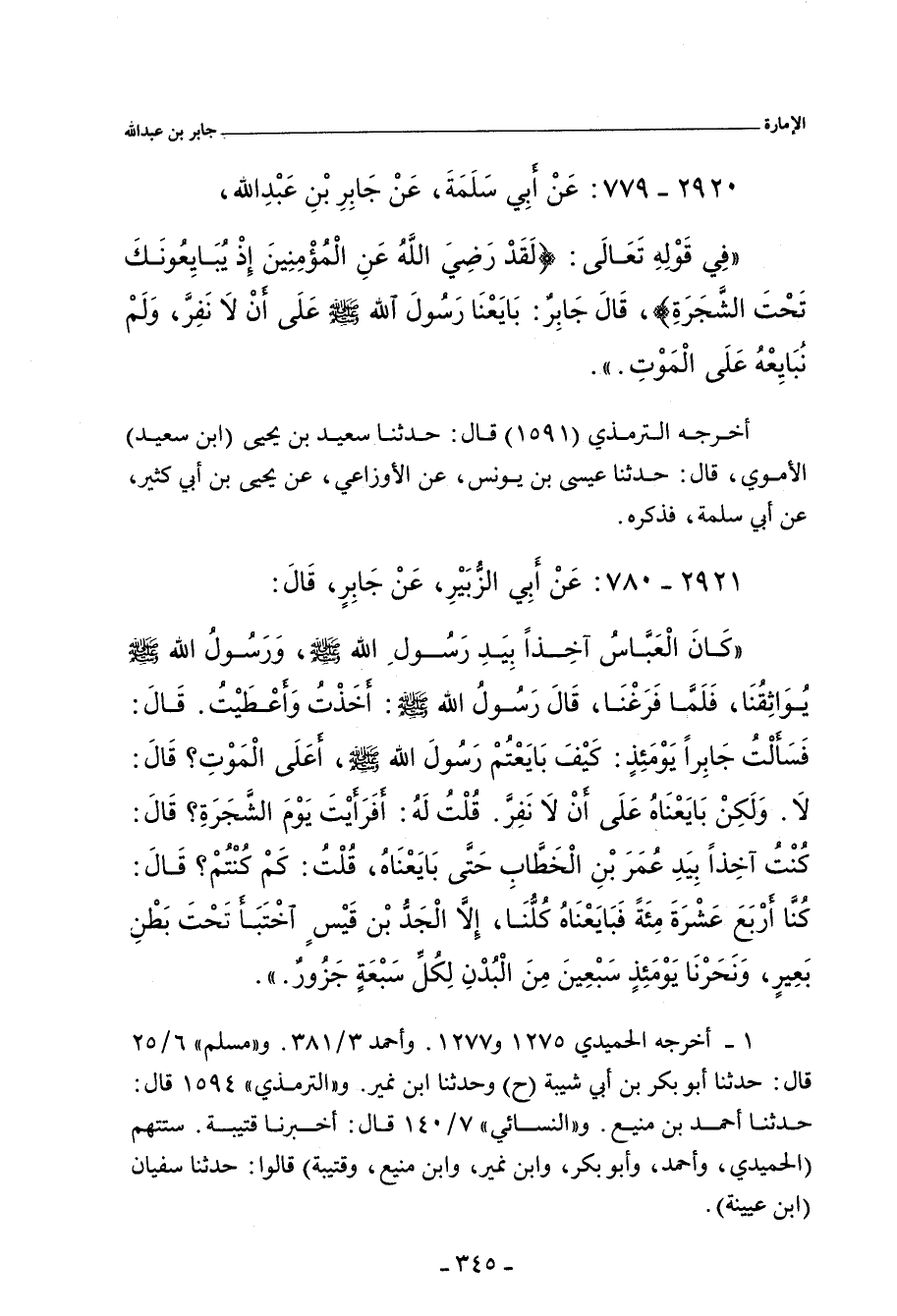 فِي قَوْلِهِ تَعَالَى: (لَقَدْ رَضِيَ اللهُ عَنِ الْمُؤْمِنِينَ إِذْ يُبَايِعُونَكَ تَحْتَ الشَّجَرَةِ) قَالَ جَابِرٌ: بَايَعْنَا رَسُولَ اللهِ صلى الله عليه وسلم عَلَى أَنْ لَا نَفِرَّ، وَلَمْ نُبَايِعْهُ عَلَى الْمَوْتِ.