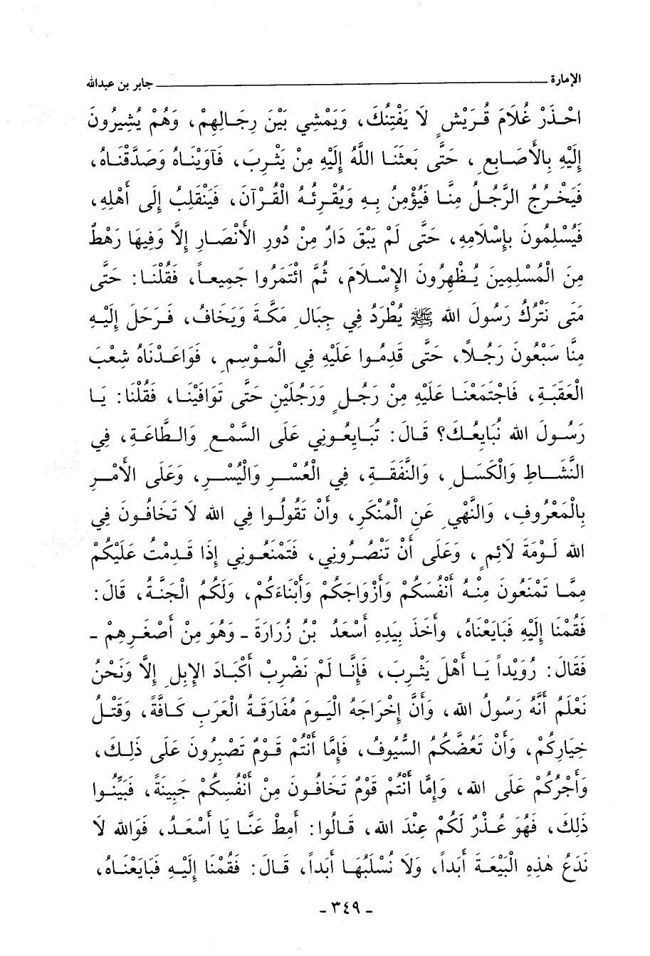 احْذَرْ غُلَامَ قُرَيْشٍ لَا يَفْتِنُكَ، وَيَمْشِي بَيْنَ رِحَالِهِمْ، وَهُمْ يُشِيرُونَ إِلَيْهِ بِالأَصَابِعِ، حَتَّى بَعَثَنَا اللهُ لَهُ مِنْ يَثْرِبَ، فَآوَيْنَاهُ وَصَدَّقْنَاهُ، فَيَخْرُجُ الرَّجُلُ مِنَّا فَيُؤْمِنُ بِهِ، وَيُقْرِئُهُ الْقُرْآنَ، فَيَنْقَلِبُ إِلَى أَهْلِهِ، فَيُسْلِمُونَ بِإِسْلَامِهِ، حَتَّى لَمْ يَبْقَ دَارٌ مِنْ دُورِ الأَنْصَارِ، إِلَاّ وَفِيهَا رَهْطٌ مِنَ الْمُسْلِمِينَ، يُظْهِرُونَ الإِسْلَامَ، ثُمَّ ائْتَمَرُوا جَمِيعًا، فَقُلْنَا: حَتَّى مَتَى نَتْرُكُ رَسُولَ اللهِ صلى الله عليه وسلم يُطْرَدُ فِي جِبَالِ مَكَّةَ وَيَخَافُ، فَرَحَلَ إِلَيْهِ مِنَّا سَبْعُونَ رَجُلاً، حَتَّى قَدِمُوا عَلَيْهِ فِي الْمَوْسِمِ، فَوَاعَدْنَاهُ شِعْبَ الْعَقَبَةِ، فَاجْتَمَعْنَا عِنْدَهُ مِنْ رَجُلٍ وَرَجُلَيْنِ، حَتَّى تَوَافَيْنَا، فَقُلْنَا: يَا رَسُولَ اللهِ، عَلَامَ نُبَايِعُكَ؟ قَالَ: تُبَايِعُونِي عَلَى السَّمْعِ وَالطَّاعَةِ، فِي النَّشَاطِ وَالْكَسَلِ، وَالنَّفَقَةِ، فِي الْعُسْرِ وَالْيُسْرِ، وَعَلَى الأَمْرِ بِالْمَعْرُوفِ، وَالنَّهْيِ عَنِ الْمُنْكَرِ، وَأَنْ تَقُولُوا فِي اللهِ، لَا تَخَافُونَ فِي اللهِ لَوْمَةَ لَائِمٍ، وَعَلَى أَنْ تَنْصُرُونِي، فَتَمْنَعُونِي إِذَا قَدِمْتُ عَلَيْكُمْ