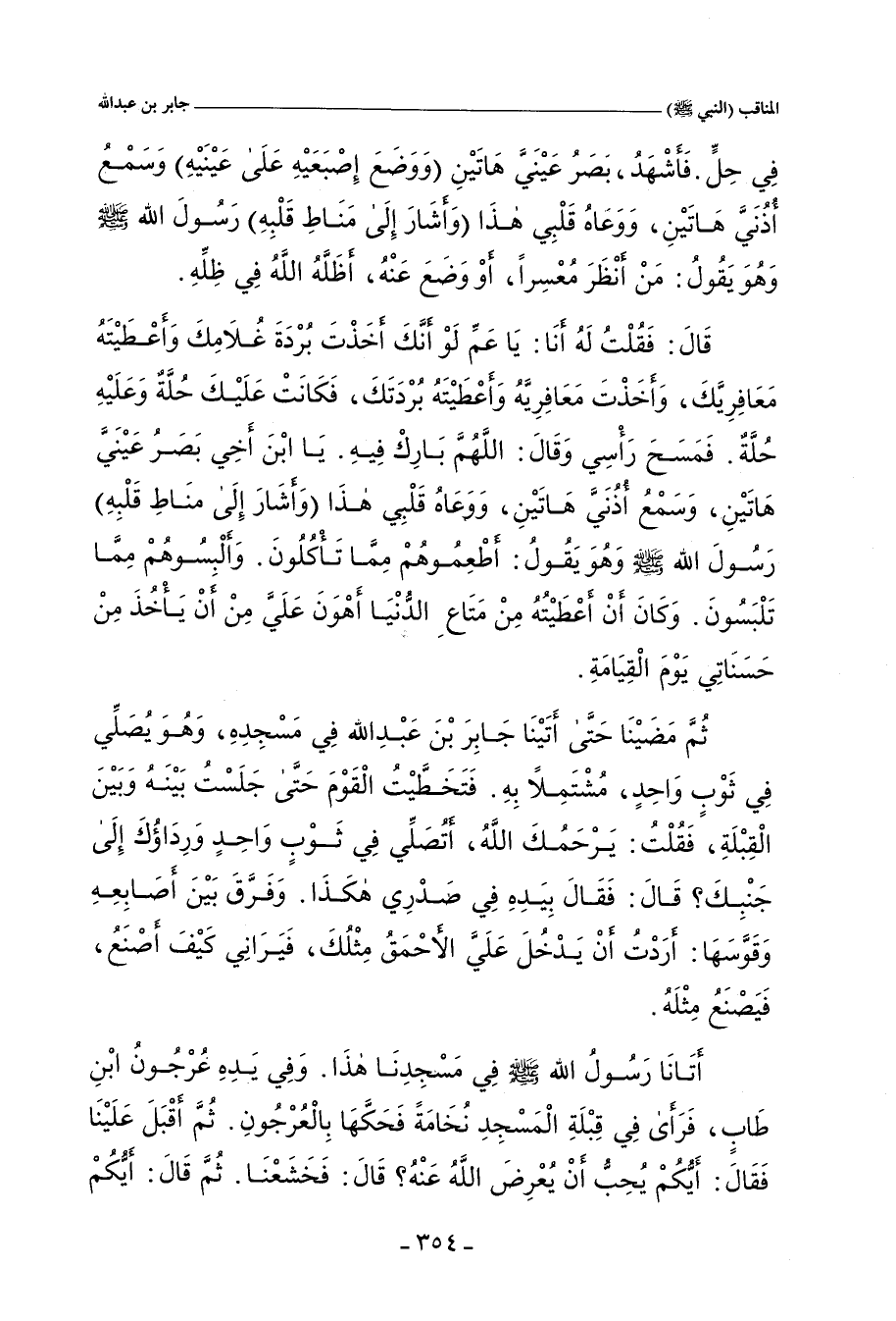 قَالَ: فَقُلْتُ لَهُ أَنَا: يَا عَمِّ، لَوْ أَنَّكَ أَخَذْتَ بُرْدَةَ غُلَامِكَ، وَأَعْطَيْتَهُ مَعَافِرِيَّكَ، وَأَخَذْتَ مَعَافِرِيَّهُ، وَأَعْطَيْتَهُ بُرْدَتَكَ، فَكَانَتْ عَلَيْكَ حُلَّةٌ، وَعَلَيْهِ حُلَّةٌ، فَمَسَحَ رَأْسِي، وَقَالَ: اللَّهُمَّ بَارِكْ فِيهِ، يَا ابْنَ أَخِي، بَصَرُ عَيْنَيَّ هَاتَيْنِ، وَسَمْعُ أُذُنَيَّ هَاتَيْنِ، وَوَعَاهُ قَلْبِي هَذَا - وَأَشَارَ إِلَى مَنَاطِ قَلْبِهِ - رَسُولَ اللهِ صلى الله عليه وسلم، وَهُوَ يَقُولُ: